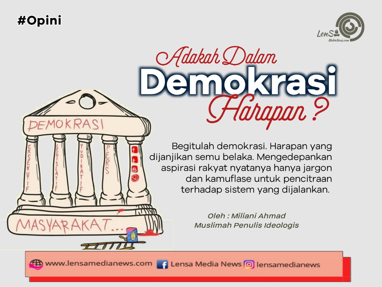 Lensa Media News – Sejak lahirnya demokrasi digadang-gadang sebagai sistem pemerintahan yang paling ideal. Demokrasi didamba menjadi pintu yang mampu mengakomodir keperluan dan kebutuhan masyarakat dalam pemerintahan. Demokrasi pun dipahami menjadi jawaban sebagai bentuk menyalurkan aspirasi masyarakat dalam pembentukan undang-undang.