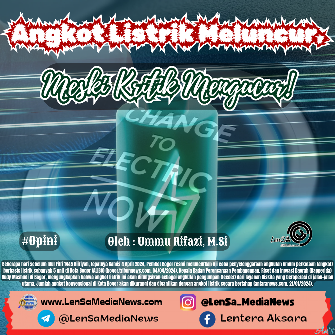 LenSaMediaNews.com – Beberapa hari sebelum Idul Fitri 1445 Hijriyah, tepatnya Kamis 4 April 2024, Pemkot Bogor resmi meluncurkan uji coba penyelenggaraan angkutan umum perkotaan (angkot) berbasis listrik sebanyak 5 unit di Kota Bogor (ALIBO) (bogor.tribunnews.com, 04/04/2024). Kepala Badan Perencanaan Pembangunan, Riset dan Inovasi Daerah (Bapperida) Rudy Mashudi di Bogor, mengungkapkan bahwa angkot listrik ini akan difungsikan sebagai angkutan pengumpan (feeder) dari layanan BisKita yang beroperasi di jalan-jalan utama. Jumlah angkot konvensional di Kota Bogor akan dikurangi dan digantikan dengan angkot listrik secara bertahap (antaranews.com, 21/01/2024).