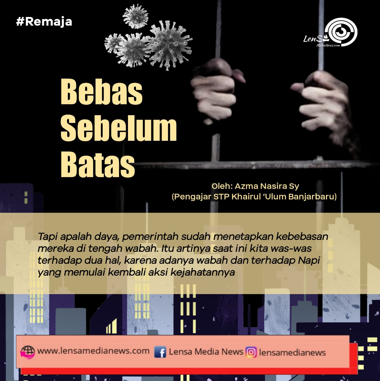 Tapi apalah daya, pemerintah sudah menetapkan kebebasan mereka di tengah wabah. Itu artinya saat ini kita was-was terhadap dua hal, karena adanya wabah dan terhadap napi yang memulai kembali aksi kejahatannya.