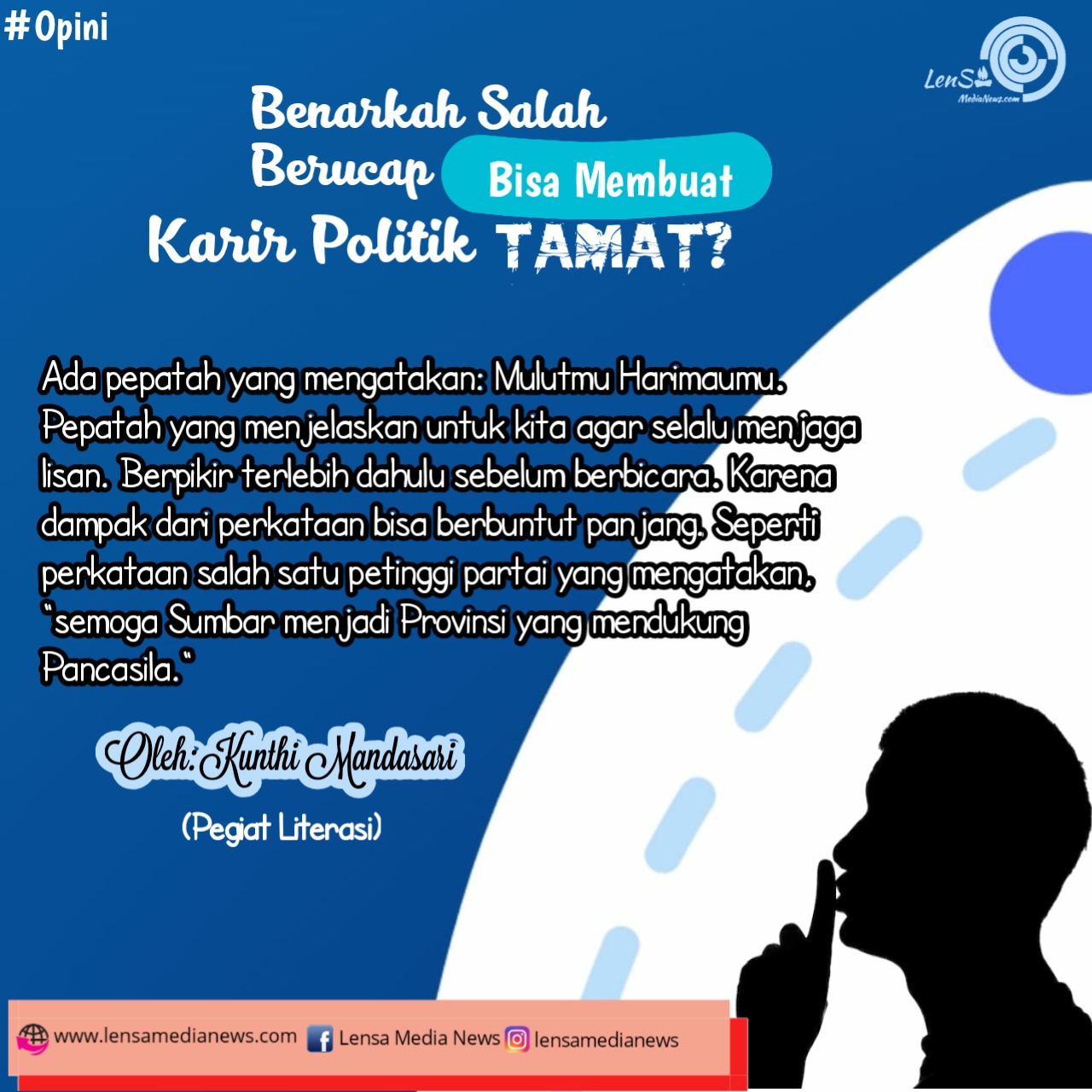 Lensa Media News – Ada pepatah yang mengatakan: Mulutmu Harimaumu. Pepatah yang menjelaskan untuk kita agar selalu menjaga lisan. Berpikir terlebih dahulu sebelum berbicara. Karena dampak dari perkataan bisa berbuntut panjang. Seperti perkataan salah satu petinggi partai yang mengatakan, “semoga Sumbar menjadi Provinsi yang mendukung Pancasila.”