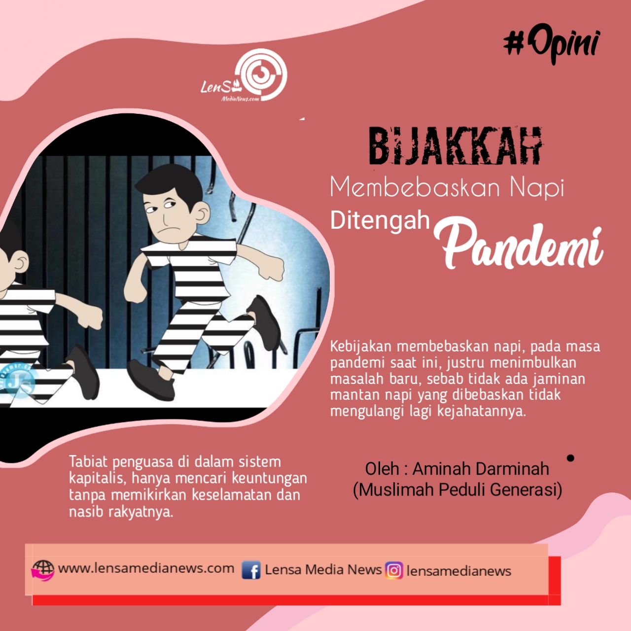 Begitulah tabiat penguasa di dalam sistem kapitalis, hanya mencari keuntungan tanpa memikirkan keselamatan dan nasib rakyatnya. Kalau alasan membebaskan napi karena over kapasitas, untuk menghindari penyebaran virus Corona, bisa dicari alternatif lain, misalnya para napi ditempatkan di gedung-gedung yang tidak terpakai.