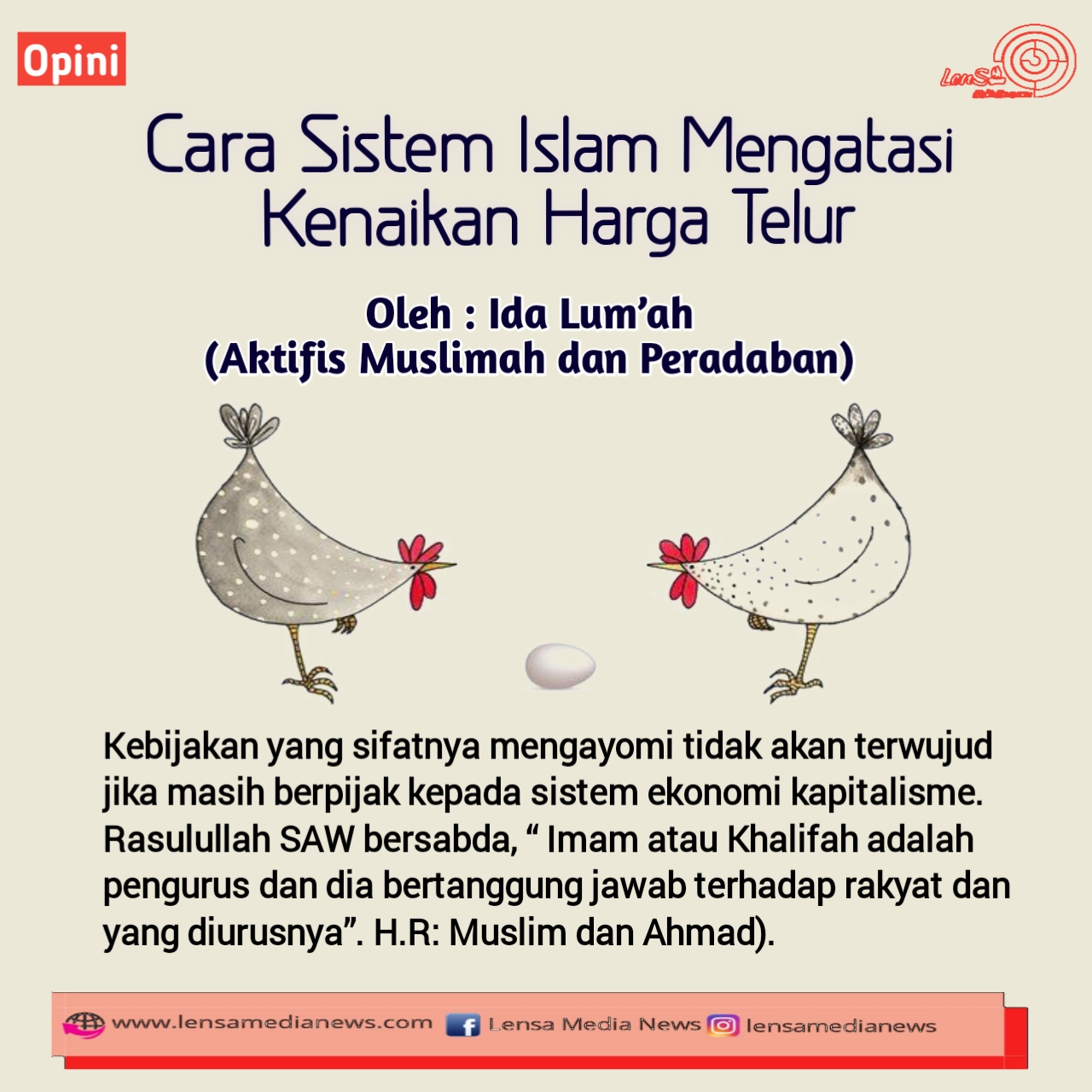Lensa Media News-Islam, adalah aqidah dan syariah, memiliki cara pandang yang khas dan tertentu, dalam memberikan solusi bagi persoalan manusia, ketidaktaatan kepada Allah SWT, banyak menimbulkan kesulitan hidup, seperti kenaikan harga telur yang saat ini tengah berlangsung. Para peternak unggas kecil merugi, terkait harga pakan yang tinggi, berimbas kepada UMKM yang berbahan telur, demikian juga rumah tangga.