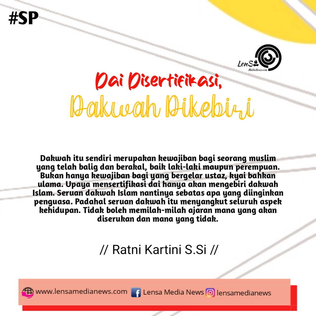 Dakwah itu sendiri merupakan kewajiban bagi seorang muslim yang telah balig dan berakal, baik laki-laki maupun perempuan. Bukan hanya kewajiban bagi yang bergelar ustaz, kyai bahkan ulama. Upaya mensertifikasi dai hanya akan mengebiri dakwah Islam. Seruan dakwah Islam nantinya sebatas apa yang diinginkan penguasa. Padahal seruan dakwah itu menyangkut seluruh aspek kehidupan. Tidak boleh memilah-milah ajaran mana yang akan diserukan dan mana yang tidak. Wallahu a’lam bisshowwab.