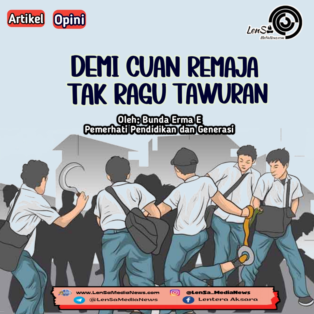 Sungguh miris, tawuran di kalangan remaja terus terjadi di tegah masyarakat. Bahkan tawuran dilakukan dengan cara kekinian, demi mendapatkan cuan. Hal ini menunjukkan rusaknya generasi dan pemikiran kebahagiaan berdasarkan materi telah menghunjam kuat dalam diri umat.