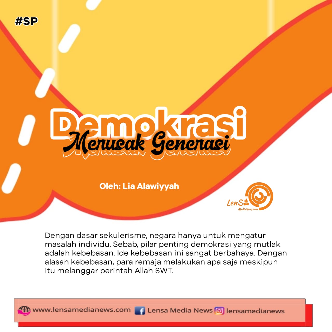 Dengan dasar sekulerisme, negara hanya untuk mengatur masalah individu. Sebab, pilar penting demokrasi yang mutlak adalah kebebasan. Ide kebebasan ini sangat berbahaya. Dengan alasan kebebasan, para remaja melakukan apa saja meskipun itu melanggar perintah Allah SWT. Mereka biasa memakai pakaian yang mengumbar aurat, melalukan seks bebas, berzina dengan alasan kebebasan. Mereka pun menggunakan narkoba, minuman keras dan obat-obatan. Paham kebebasan inilah yang menghancurkan generasi muda. Paham ini mengagungkan kebebasan sebagai sebuah kebenaran.