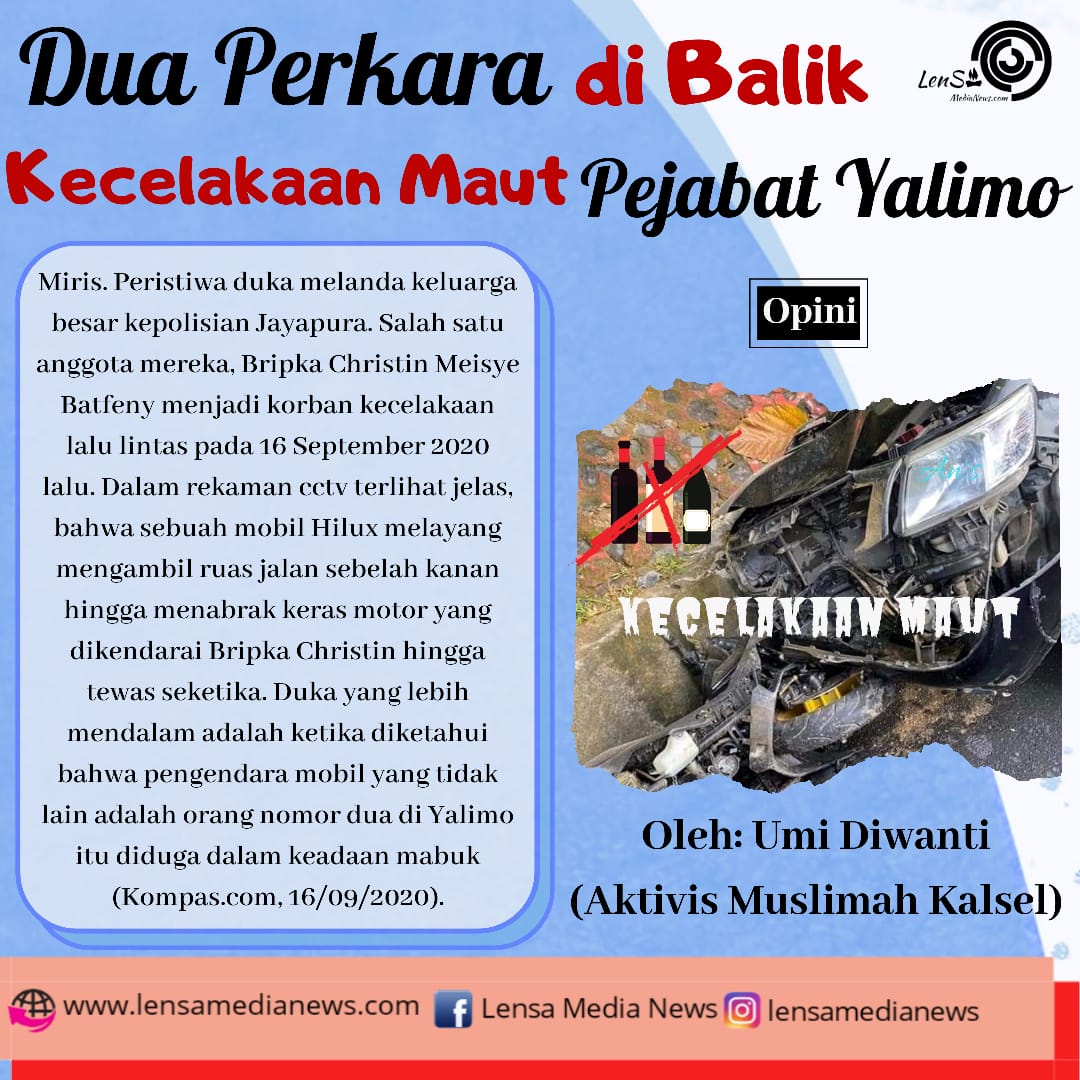 Lensa Media News – Miris. Peristiwa duka melanda keluarga besar kepolisian Jayapura. Salah satu anggota mereka, Bripka Christin Meisye Batfeny menjadi korban kecelakaan lalu lintas pada 16 September 2020 lalu. Dalam rekaman cctv terlihat jelas, bahwa sebuah mobil Hilux melayang mengambil ruas jalan sebelah kanan hingga menabrak keras motor yang dikendarai Bripka Christin hingga tewas seketika. Duka yang lebih mendalam adalah ketika diketahui bahwa pengendara mobil yang tidak lain adalah orang nomor dua di Yalimo itu diduga dalam keadaan mabuk (Kompas.com, 16/09/2020).