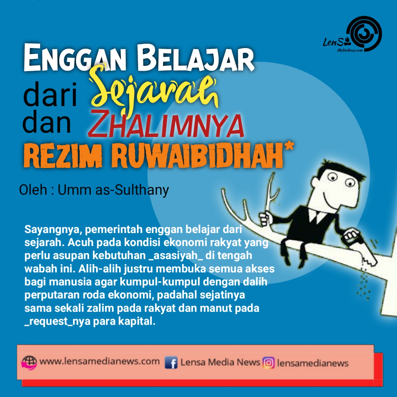 Sayangnya, pemerintah enggan belajar dari sejarah. Acuh pada kondisi ekonomi rakyat yang perlu asupan kebutuhan asasiyah di tengah wabah ini. Alih-alih justru membuka semua akses bagi manusia agar kumpul-kumpul dengan dalih perputaran roda ekonomi, padahal sejatinya sama sekali zalim pada rakyat dan manut pada requestnya para kapital.