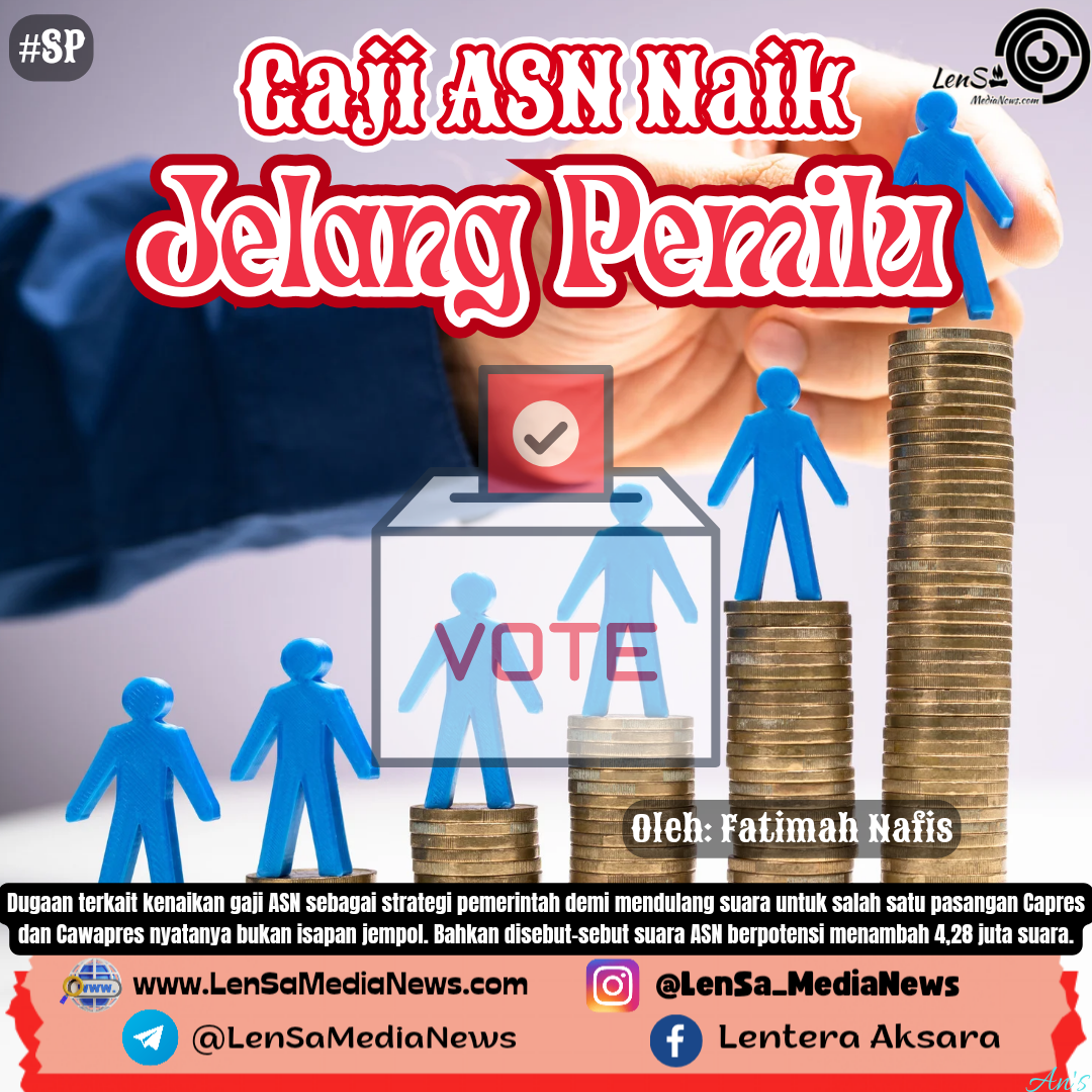 LenSaMediaNews.com – Dugaan terkait kenaikan gaji ASN sebagai strategi pemerintah demi mendulang suara untuk salah satu pasangan Capres dan Cawapres nyatanya bukan isapan jempol. Bahkan disebut-sebut suara ASN berpotensi menambah 4,28 juta suara. Meski begitu, Kepala Biro Data, Hukum dan Komunikasi Publik KemenpanRB, Mohammad Averrouce menyebut kenaikan gaji ini hanya untuk meningkatkan kinerja dan kesejahteraan ASN serta mengakselerasi transformasi ekonomi dan pembangunan nasional. (BBC Indonesia)