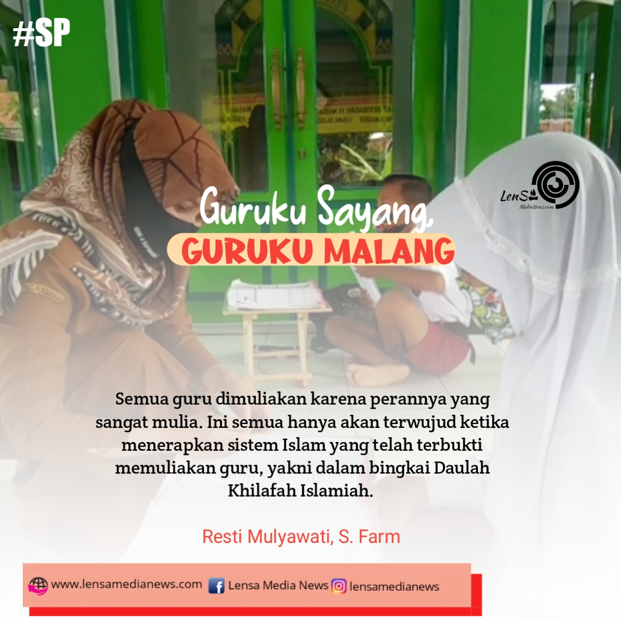 Berbeda halnya dengan Islam, sungguh Islam sangat memuliakan posisi guru. Kesejahteraan guru sangat diperhatikan. Semisal pada masa Khalifah Umar bin Khattab, gaji guru adalah 15 Dinar/bulan atau setara Rp 36.350.250 (1dinar = 4,25gr. Dan jika 1gr = Rp 570.200) maka para guru akan bersemangat dan fokus dalam mendidik generasi. Dan yang paling penting, posisi guru dalam sistem Islam semuanya adalah sebagai aparatur negara. Tidak ada perbedaan status guru PNS dan Honorer. Semua guru dimuliakan karena perannya yang sangat mulia. Ini semua hanya akan terwujud ketika menerapkan sistem Islam yang telah terbukti memuliakan guru, yakni dalam bingkai Daulah Khilafah Islamiah.