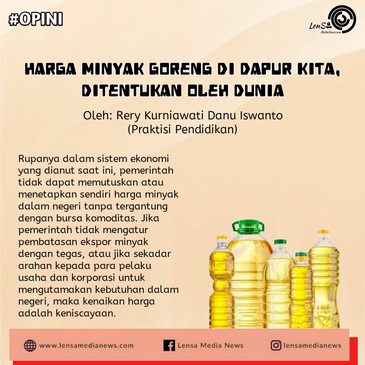 Lensa Media News – Adakah yang belum menyadari jika harga minyak goreng naik tinggi sekali? Bagi ibu-ibu yang jarang belanja kebutuhan dapur, bisa jadi belum tahu jika beberapa minggu ini harga minyak goreng naik. Atau bagi ibu-ibu yang jika belanja tidak memperhatikan harga, hanya mengambil barang, bayar, dan selesai urusan belanja, mungkin juga tidak menyadari kenaikan harga ini. Fyi, terjadi kenaikan harga yang sangat tinggi yaitu Rp. 17.400 per liter. Bahkan di beberapa daerah seperti Papua dan Gorontalo mencapai Rp.18.550 – Rp.20.150 per liter (Cnnindonesia.com, 27/10/2021).