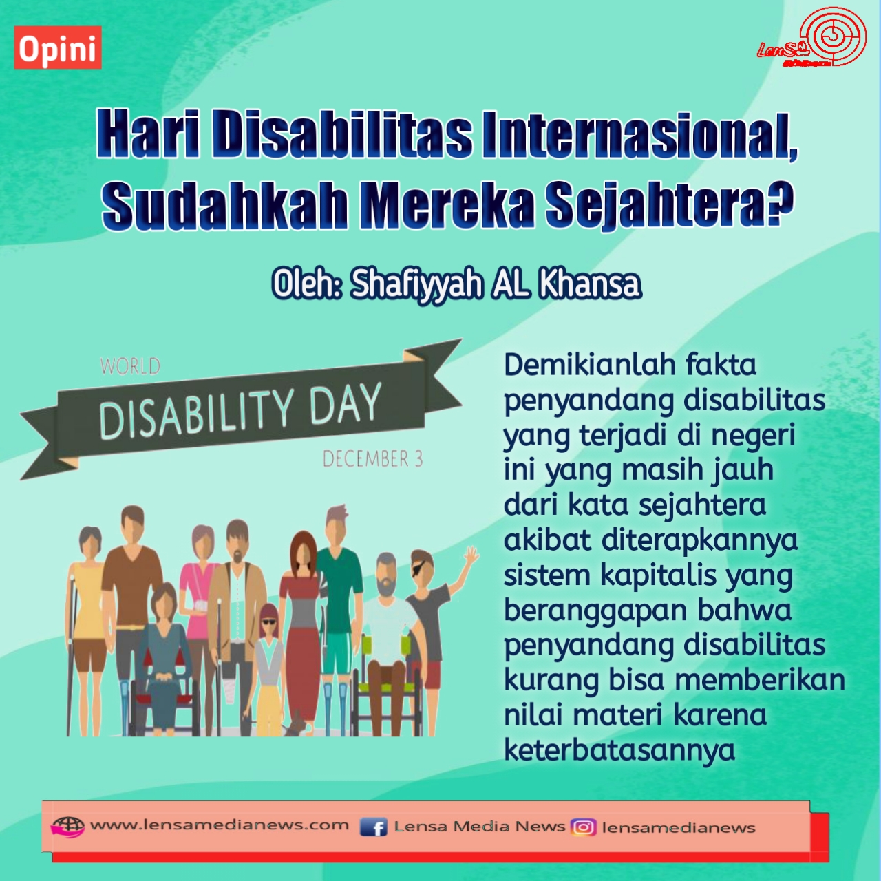 Demikianlah fakta penyandang disabilitas yang terjadi di negeri ini yang masih jauh dari kata sejahtera akibat diterapkannya sistem kapitalis yang beranggapan bahwa penyandang disabilitas kurang bisa memberikan nilai materi karena keterbatasannya. Berbeda dengan perlakuan di dalam sistem Islam yakni khilafah. Di dalam sistem khilafah penguasa berkewajiban sebagai raa’in yang bertanggung jawab untuk mengurusi rakyatnya termasuk bagi para penyandang disabilitas, penguasa dalam sistem khilafah wajib menjamin segala kebutuhan seluruh rakyatnya bahkan kepada penyandang disabilitas yang akan dipenuhi segala kebutuhannya.