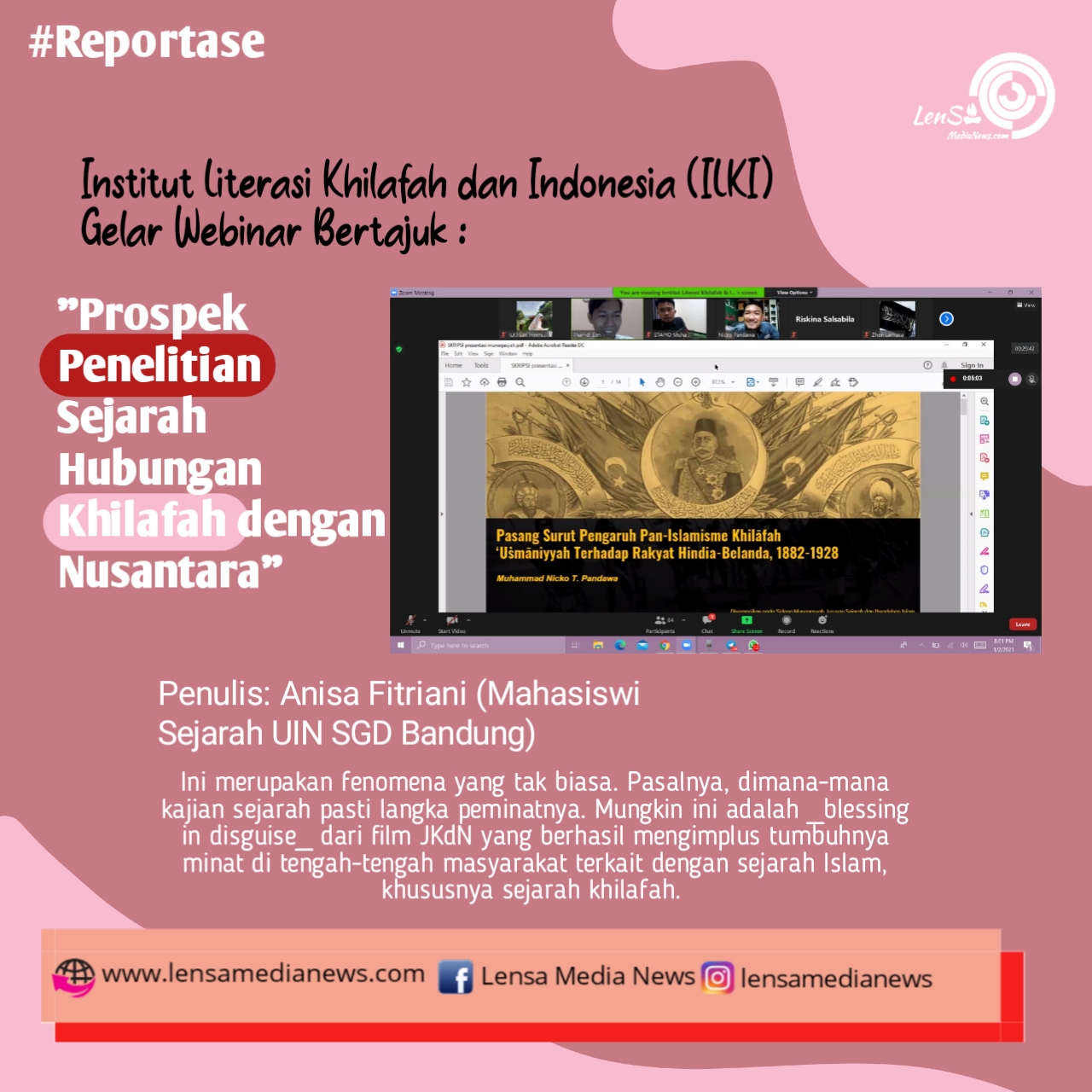 Reportase – Di tahun baru 2021 ini, ILKI (Institut Literasi Khilafah dan Indonesia) telah menyelenggarakan Kelas Lingkar Kajian Sejarah (LKS) yang diselenggarakan dua kali (Sabtu, 02 Januari dan Senin, 04 Januari). Dalam webinar pertama, ILKI mengundang Nicko Pandawa (script writer film JKdN) sebagai narasumber yang mengangkat tema tentang “Prospek Penelitian Sejarah Keterikatan Nusantara dan Khilafah, Studi Kasus: Pasang Surut Pengaruh Pan-Islamisme Khilafah Utsmaniyyah Terhadap Rakyat Hindia-Belanda, 1882-1928.” Webinar pertama yang diselenggarakan ILKI ini dihadiri oleh kurang lebih 120 peserta. Kemudian pada webinar kedua, ILKI mengundang Septian A.W (sejarawan JKdN) sebagai narasumber dan mengangkat tema “Prospek Penelitian Hubungan Khilafah dan Nusantara.” Webinar kedua ini dihadiri oleh kurang lebih 85 peserta. Kedua webinar tersebut dipandu oleh Ilhamdi (alumni Sejarah FIB UI). Peserta yang menghadirinya pun begitu antusias.