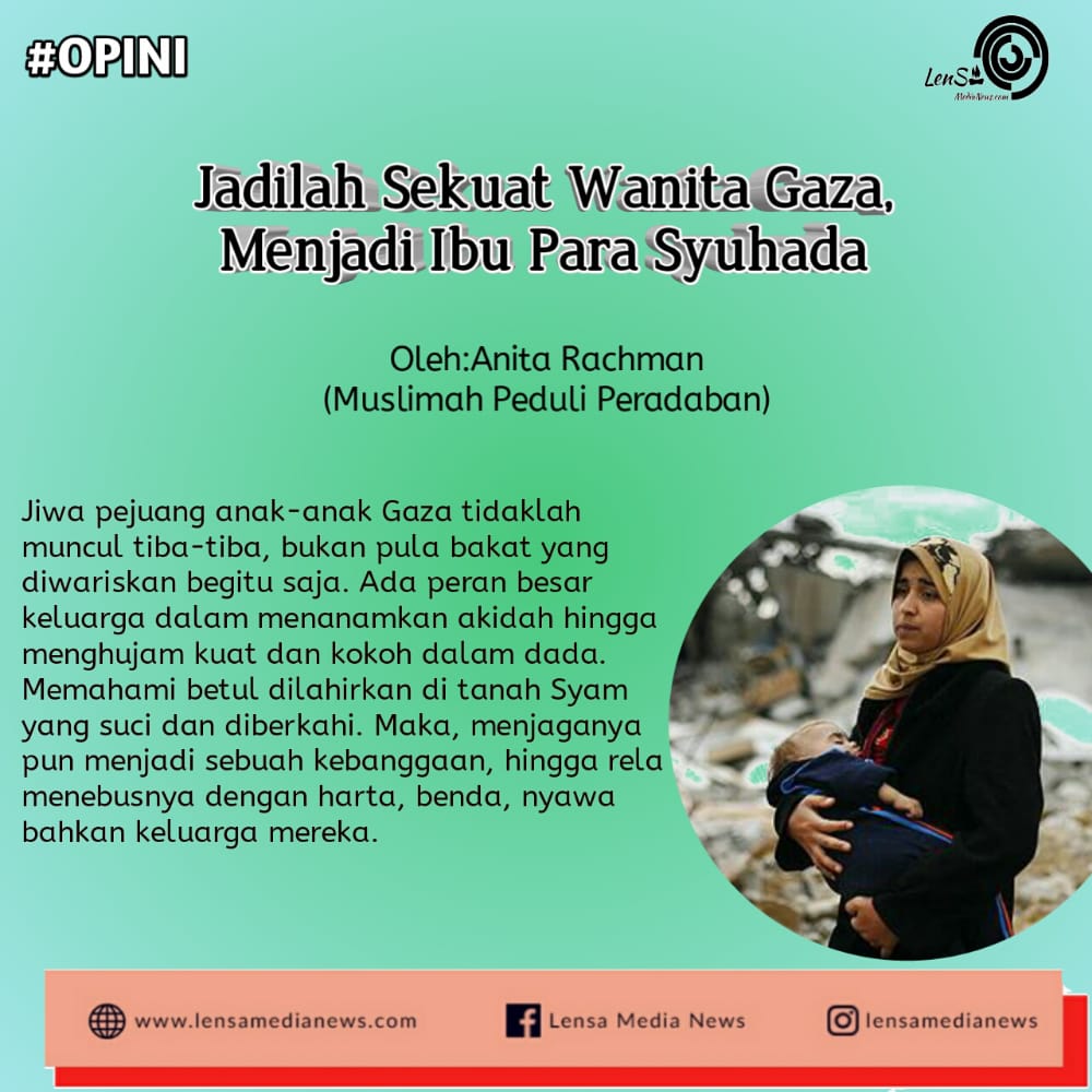 Jadilah sekuat wanita gaza, mencetak para penolong agama Allah, tak melulu dengan senjata, tapi dengan dakwah, membangkitkan pemikiran umat, membebaskannya dari penjajahan sistem kufur sekularisme, kapitalisme, liberalisme, menuju cahaya Islam yang rahmatan lil’alamin.