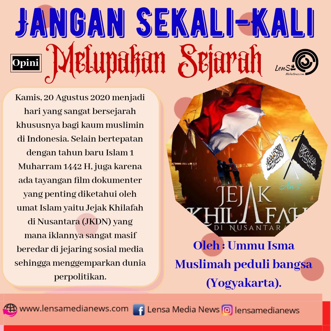 Lensa Media News – Kamis, 20 Agustus 2020 menjadi hari yang sangat bersejarah khususnya bagi kaum muslimin di Indonesia. Selain bertepatan dengan tahun baru Islam 1 Muharram 1442 H, juga karena ada tayangan film dokumenter yang penting diketahui oleh umat Islam yaitu Jejak Khilafah di Nusantara (JKDN) yang mana iklannya sangat masif beredar di jejaring sosial media sehingga menggemparkan dunia perpolitikan.