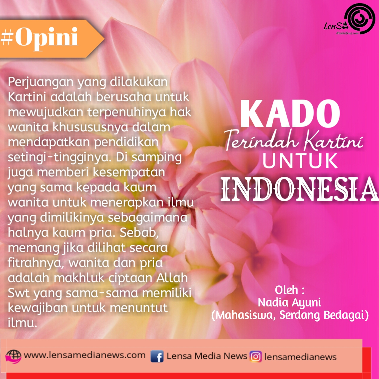 Jadi, upaya Kartini dalam memenuhi salah satu hak wanita agar dapat mengecap pendidikan adalah hal yang benar dan wajar. Dan perjuangan beliau adalah suatu perbuatan yang mulia. Kartini telah memberikan kado terindah bagi Indonesia berupa emansipasi wanita. Emansipasi ini mengingatkan kepada kita akan pentingnya pendidikan bagi setiap insan baik wanita maupun pria. Sebab dengan ilmu itulah yang dapat mengantarkan setiap insan untuk memperoleh kebahagiaan dunia dan akhirat.