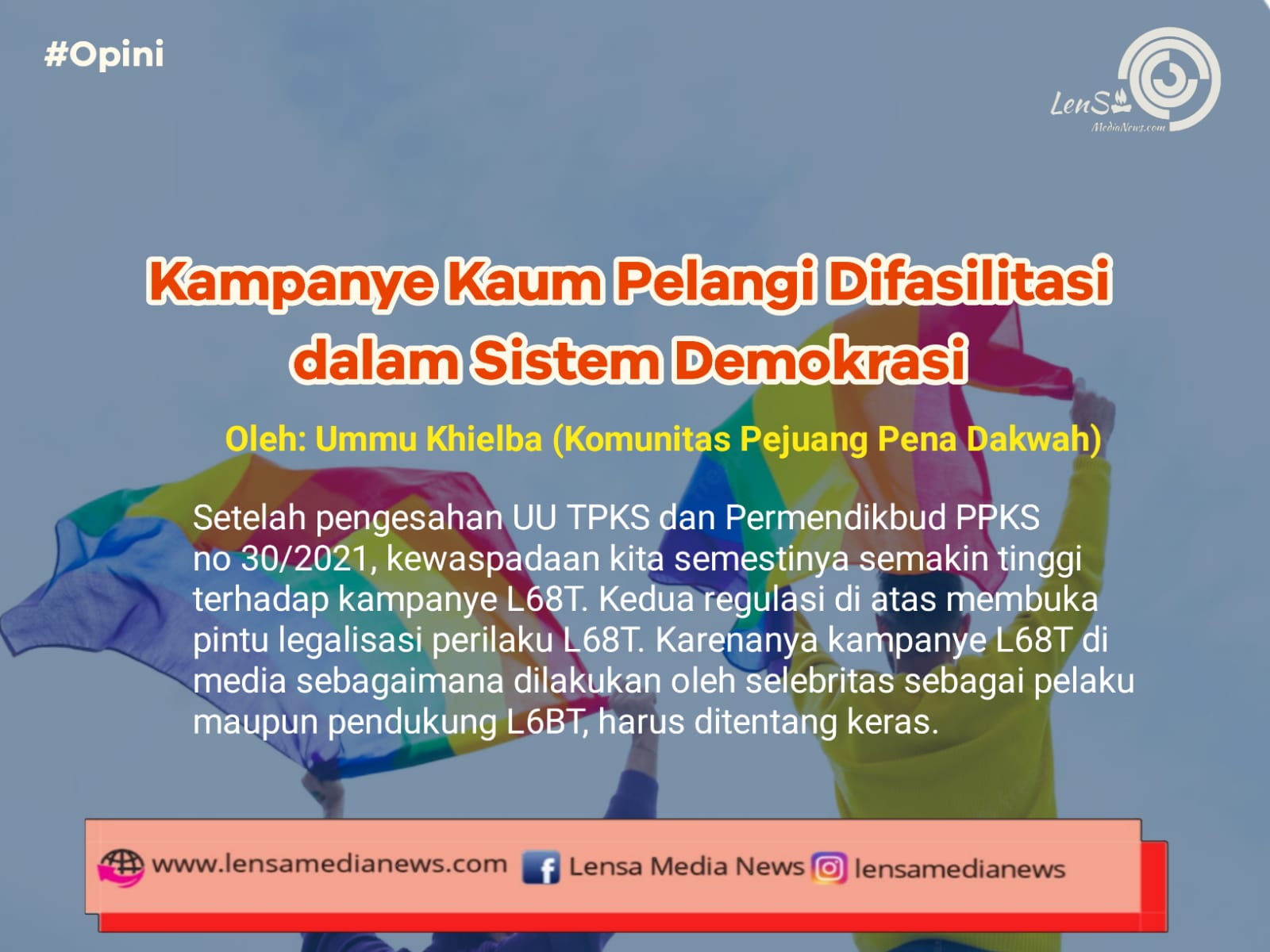 Lensa Media News – Setelah pengesahan UU TPKS dan Permendikbud PPKS no 30/2021, kewaspadaan kita semestinya semakin tinggi terhadap kampanye L68T. Kedua regulasi di atas membuka pintu legalisasi perilaku L68T. Karenanya kampanye L68T di media sebagaimana dilakukan oleh selebritas sebagai pelaku maupun pendukung L6BT, harus ditentang keras.