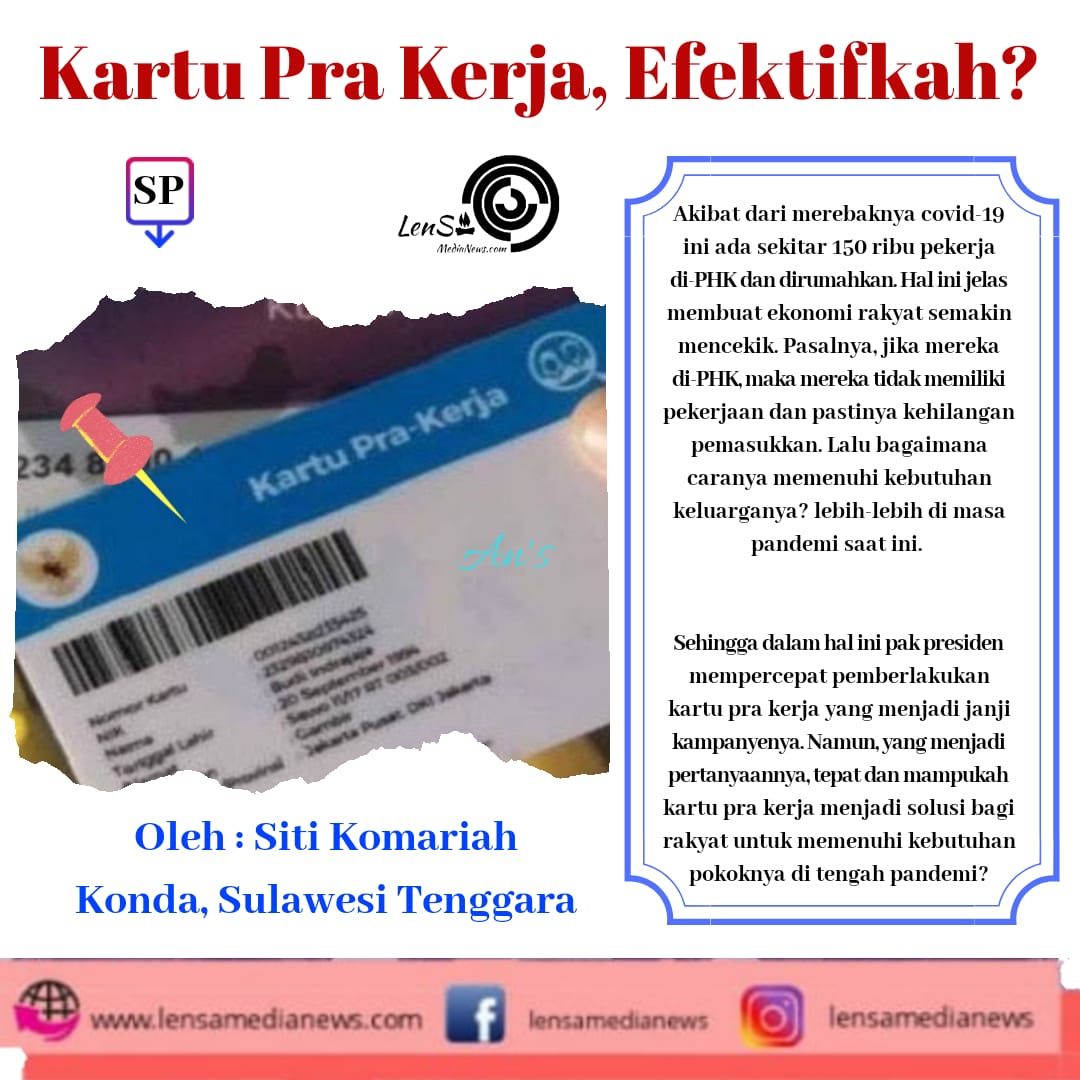 Jika ditelisik, ditengah pandemi seperti saat ini sepertinya kartu pra kerja tidak cocok diterapkan kepada rakyat. Mengigat konsep kartu pra kerja itu sendiri adalah pemberian bantuan berupa biaya pelatihan untuk meningkatkan keterampilan, nah sehingga bantuan tersebut tidak bisa dirasakan langsung oleh rakyat di musim pandemi ini, sedangkan saat ini rakyat baik yang terdampak PHK atau pun tidak lebih membutuhkan bantuan langsung tunai (BLT) guna memenuhi kebutuhan hidupnya.