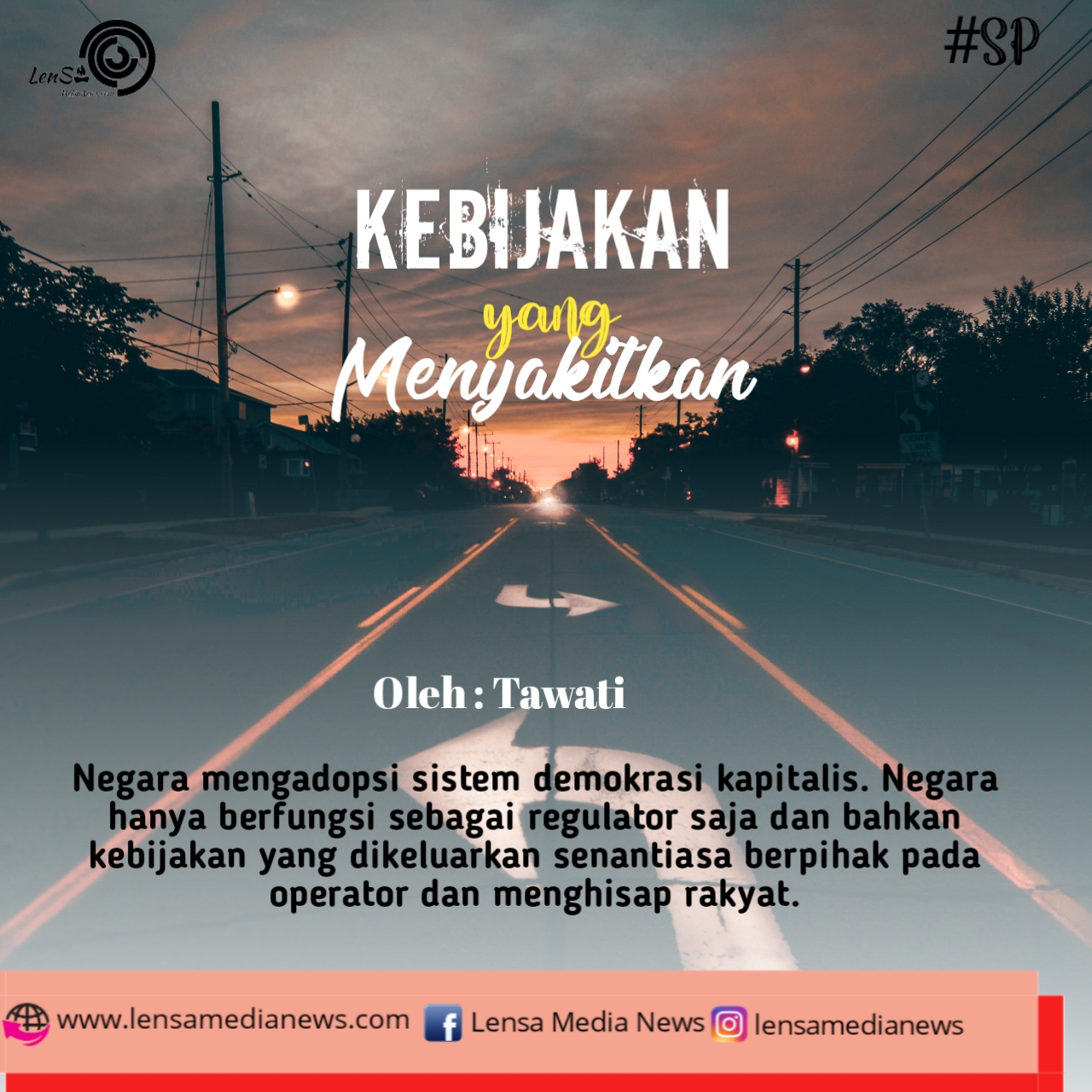 Negara mengadopsi sistem demokrasi kapitalis. Negara hanya berfungsi sebagai regulator saja dan bahkan kebijakan yang dikeluarkan senantiasa berpihak pada operator dan menghisap rakyat.