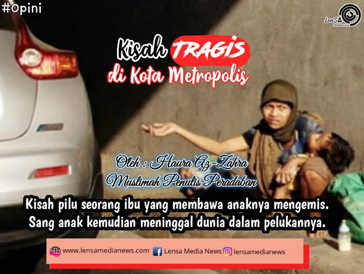 Lensa Media News – Kisah pilu seorang ibu yang membawa anaknya mengemis. Sang anak kemudian meninggal dunia dalam pelukannya. Ternyata hidup di kota metropolis dengan segala akses modern dan gedung-gedung mewah, tidak cukup membuat ibu dan anaknya hidup nyaman dan berkecukupan. Justru mereka harus mencari penghasilan dengan mengemis agar mendapatkan uang untuk melanjutkan hidupnya.