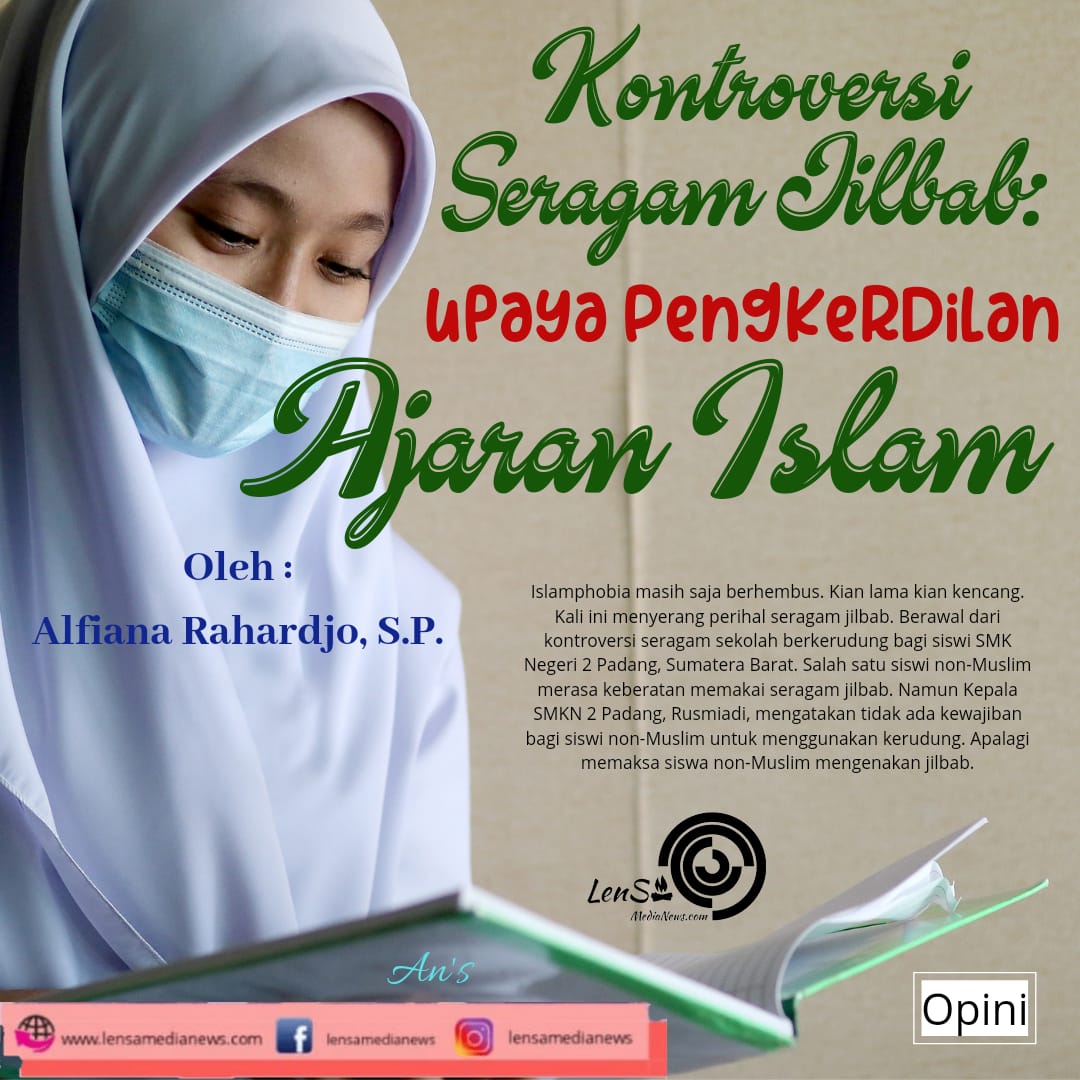 Lensamedia.com– Islamphobia masih saja berhembus. Kian lama kian kencang. Kali ini menyerang perihal seragam jilbab. Berawal dari kontroversi seragam sekolah berkerudung bagi siswi SMK Negeri 2 Padang, Sumatera Barat. Salah satu siswi non-Muslim merasa keberatan memakai seragam jilbab. Namun Kepala SMKN 2 Padang, Rusmiadi, mengatakan tidak ada kewajiban bagi siswi non-Muslim untuk menggunakan kerudung. Apalagi memaksa siswa non-Muslim mengenakan jilbab.