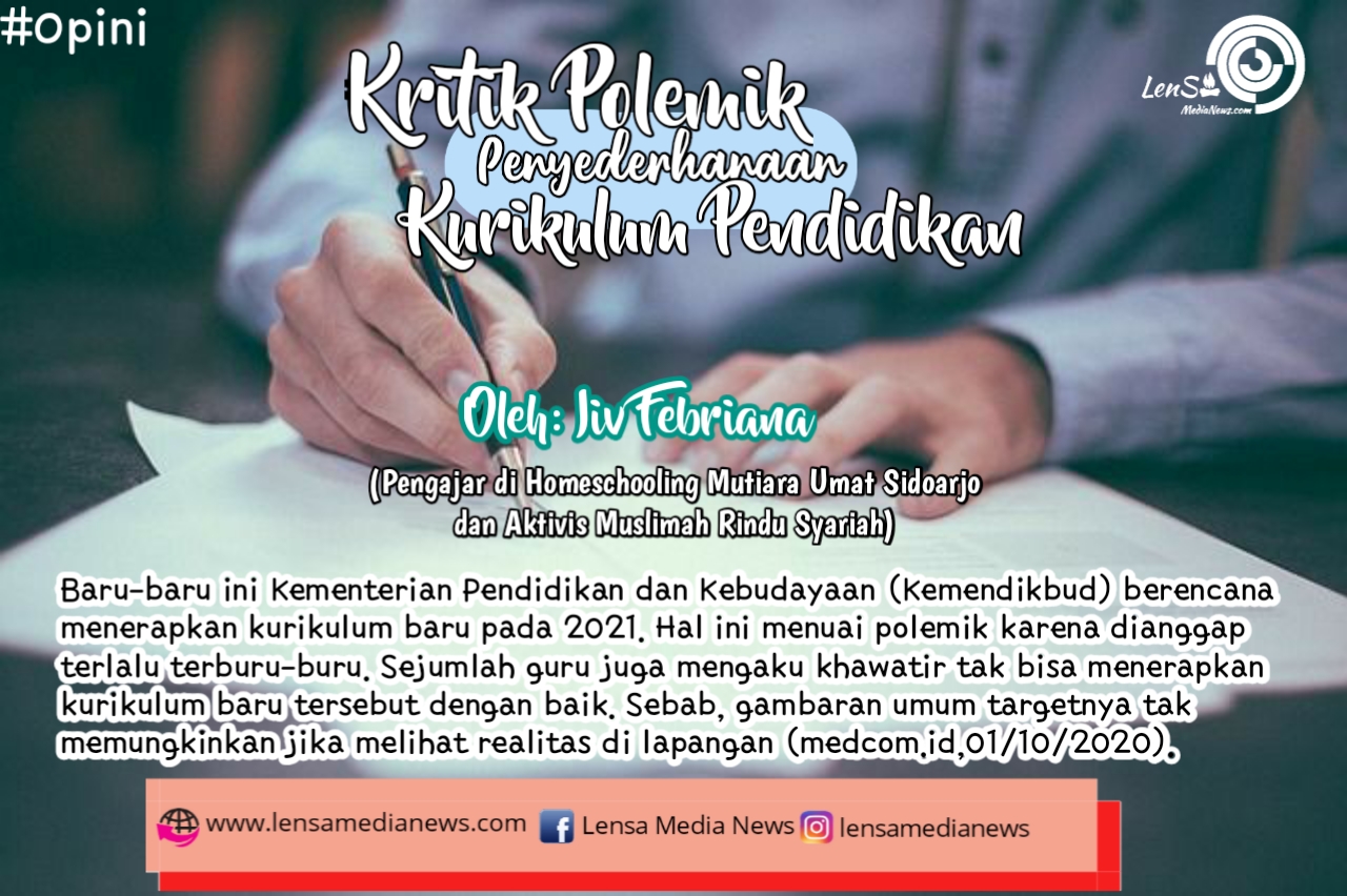 Baru-baru ini, Kementerian Pendidikan dan Kebudayaan (Kemendikbud) berencana menerapkan kurikulum baru pada 2021. Hal ini menuai polemik karena dianggap terlalu terburu-buru. Sejumlah guru juga mengaku khawatir tak bisa menerapkan kurikulum baru tersebut dengan baik. Sebab, gambaran umum targetnya tak memungkinkan jika melihat realitas di lapangan (medcom.id,01/10/2020).