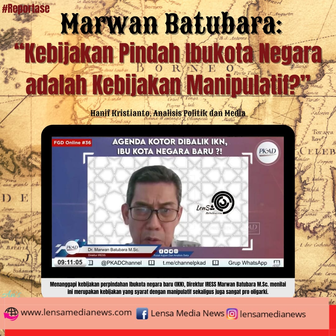Reportase – Menanggapi kebijakan perpindahan Ibukota negara baru (IKN), Direktur IRESS Marwan Batubara M.Sc. menilai ini merupakan kebijakan yang syarat dengan manipulatif sekaligus juga sangat pro oligarki.