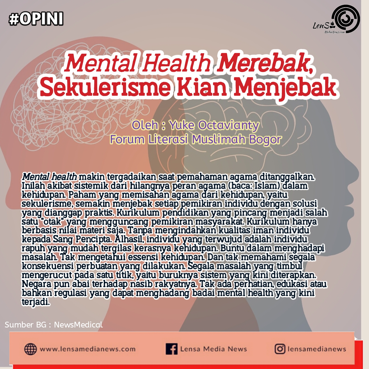 Mental health makin tergadaikan saat pemahaman agama ditanggalkan. Inilah akibat sistemik dari hilangnya peran agama (baca: Islam) dalam kehidupan. Paham yang memisahan agama dari kehidupan, yaitu sekulerisme, semakin menjebak setiap pemikiran individu dengan solusi yang dianggap praktis. Kurikulum pendidikan yang pincang menjadi salah satu “otak” yang mengguncang pemikiran masyarakat. Kurikulum hanya berbasis nilai materi saja. Tanpa mengindahkan kualitas iman individu kepada Sang Pencipta. Alhasil, individu yang terwujud adalah individu rapuh yang mudah tergilas kerasnya kehidupan. Buntu dalam menghadapi masalah. Tak mengetahui essensi kehidupan. Dan tak memahami segala konsekuensi perbuatan yang dilakukan. Segala masalah yang timbul mengerucut pada satu titik, yaitu buruknya sistem yang kini diterapkan. Negara pun abai terhadap nasib rakyatnya. Tak ada perhatian, edukasi atau bahkan regulasi yang dapat menghadang badai mental health yang kini terjadi.