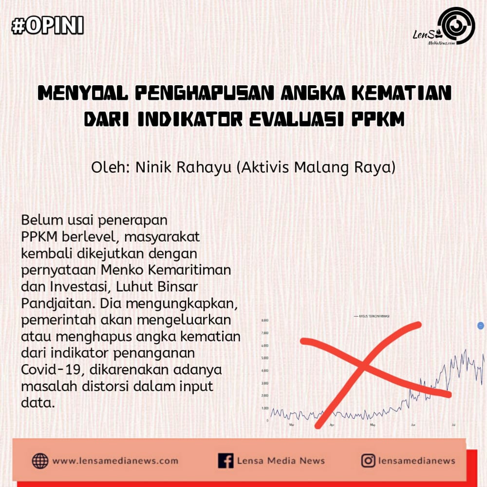 Lensa Media News – Belum usai penerapan PPKM berlevel, masyarakat kembali dikejutkan dengan pernyataan Menko Kemaritiman dan Investasi, Luhut Binsar Pandjaitan. Dia mengungkapkan, pemerintah akan mengeluarkan atau menghapus angka kematian dari indikator penanganan Covid-19, dikarenakan adanya masalah distorsi dalam input data.