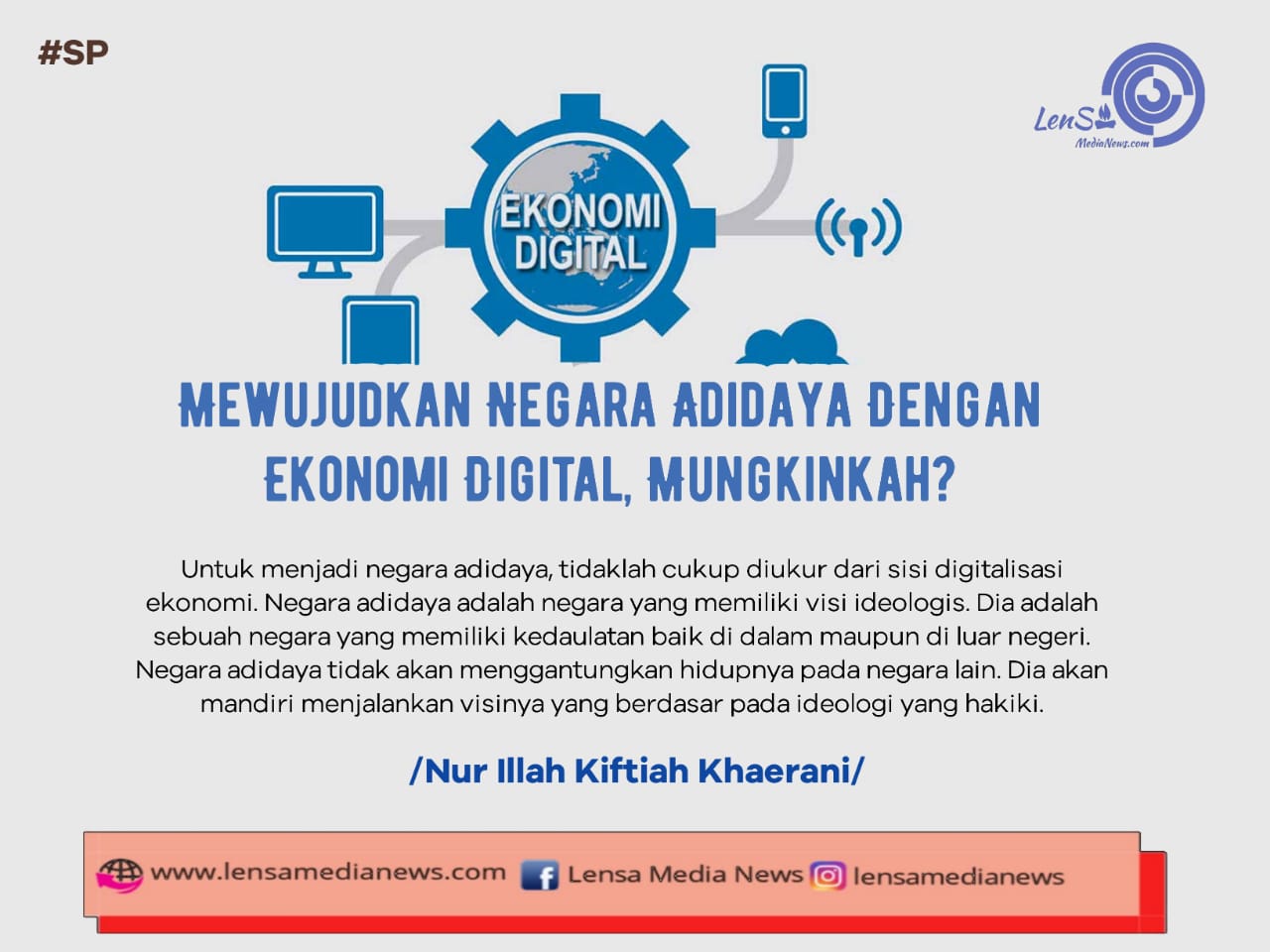 Era ekonomi digital telah meniscayakan sebuah kehidupan baru bagi manusia di dunia nyata maupun maya. Terlebih dengan adanya pandemi covid-19, kian memperbesar peluang perubahan pola aktifitas masyarakat sehingga mendorong berkembangnya kegiatan jarak jauh. Pada era ini hampir setiap orang menggunakan media sosial untuk mengakses berbagai informasi secara online. Oleh karenanya, Indonesia dianggap bisa menjadi negara adidaya dan mempersiapkan diri untuk melakukan transformasi digital lebih cepat. Pertanyaannya, apakah ekonomi digital menjadi penanda sebuah negara adi daya?