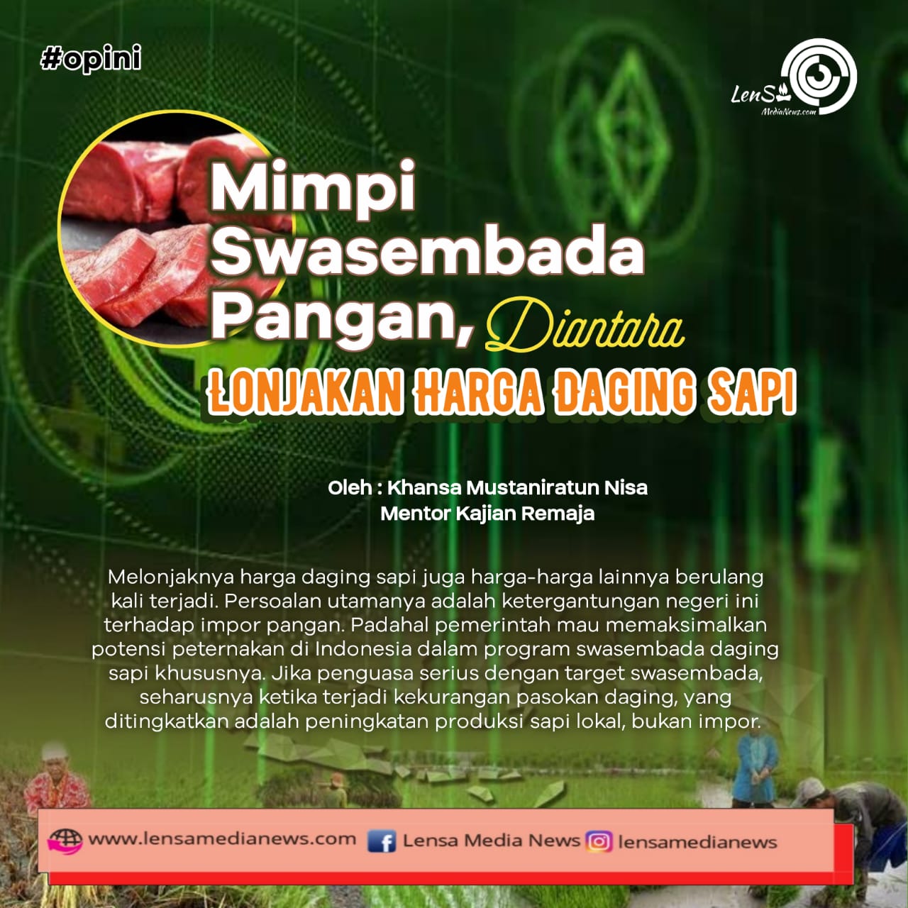 Melonjaknya harga daging sapi juga harga-harga lainnya berulang kali terjadi. Persoalan utamanya adalah ketergantungan negeri ini terhadap impor pangan. Padahal pemerintah mau memaksimalkan potensi peternakan di Indonesia dalam program swasembada daging sapi khususnya. Jika penguasa serius dengan target swasembada, seharusnya ketika terjadi kekurangan pasokan daging, yang ditingkatkan adalah peningkatan produksi sapi lokal, bukan impor.