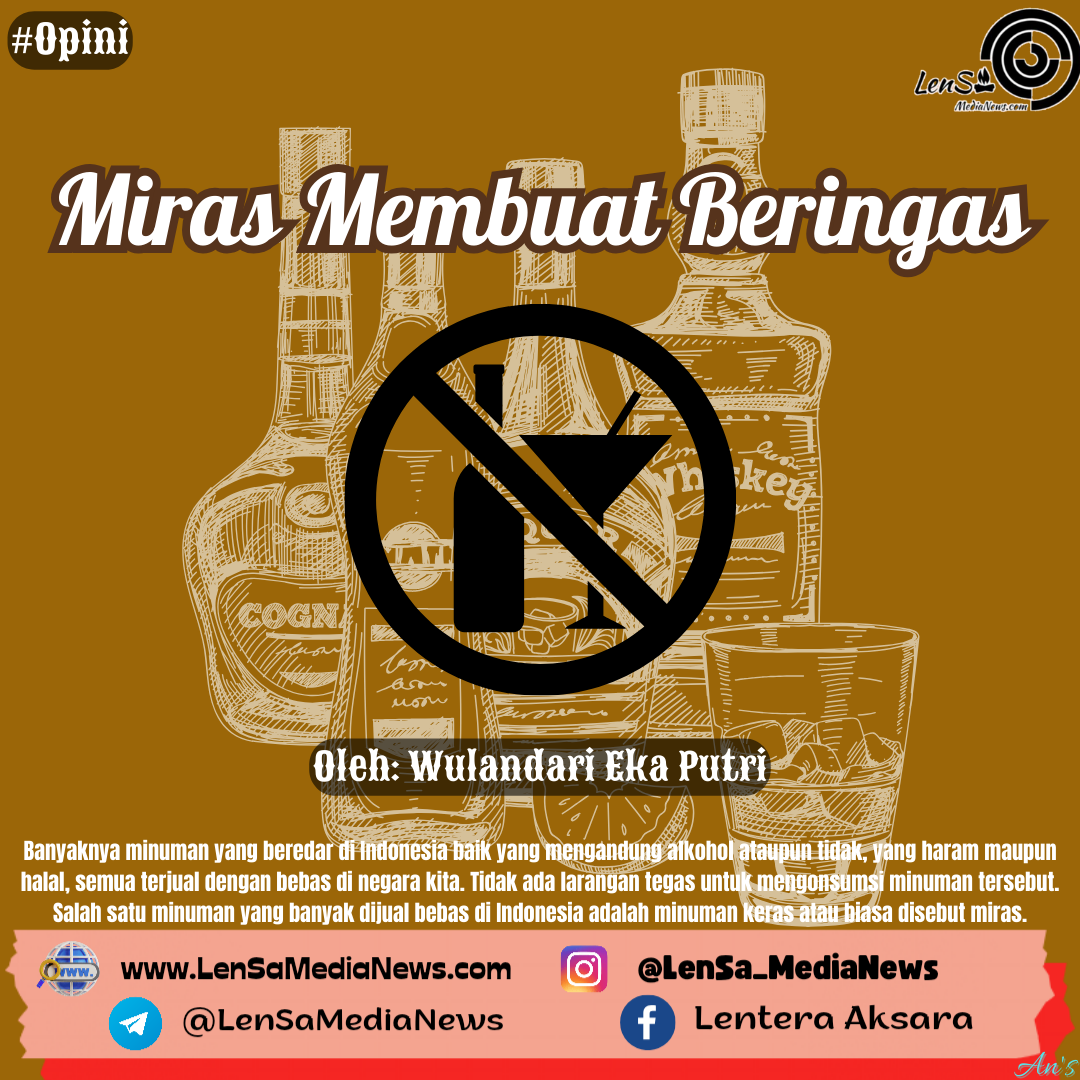 Minuman keras adalah minuman yang mengandung alkohol dan dapat mengakibatkan ketagihan yang berbahaya bagi pemakainya. Miras dapat memengaruhi pikiran, suasana hati dan perilaku, serta berakibat pada kerusakan fungsi organ tubuh. Dari pengertiannya saja sudah jelas bahwa miras sangat berbahaya. Terlebih lagi, haram untuk dikonsumsi terutama bagi kaum muslim. Namun masyarakat kita masih banyak yang mengonsumsi miras yang sudah jelas sangat membahayakan bagi peminumnya. Sehingga bisa merubah perilaku seorang menjadi beringas dan tidak terkendali.