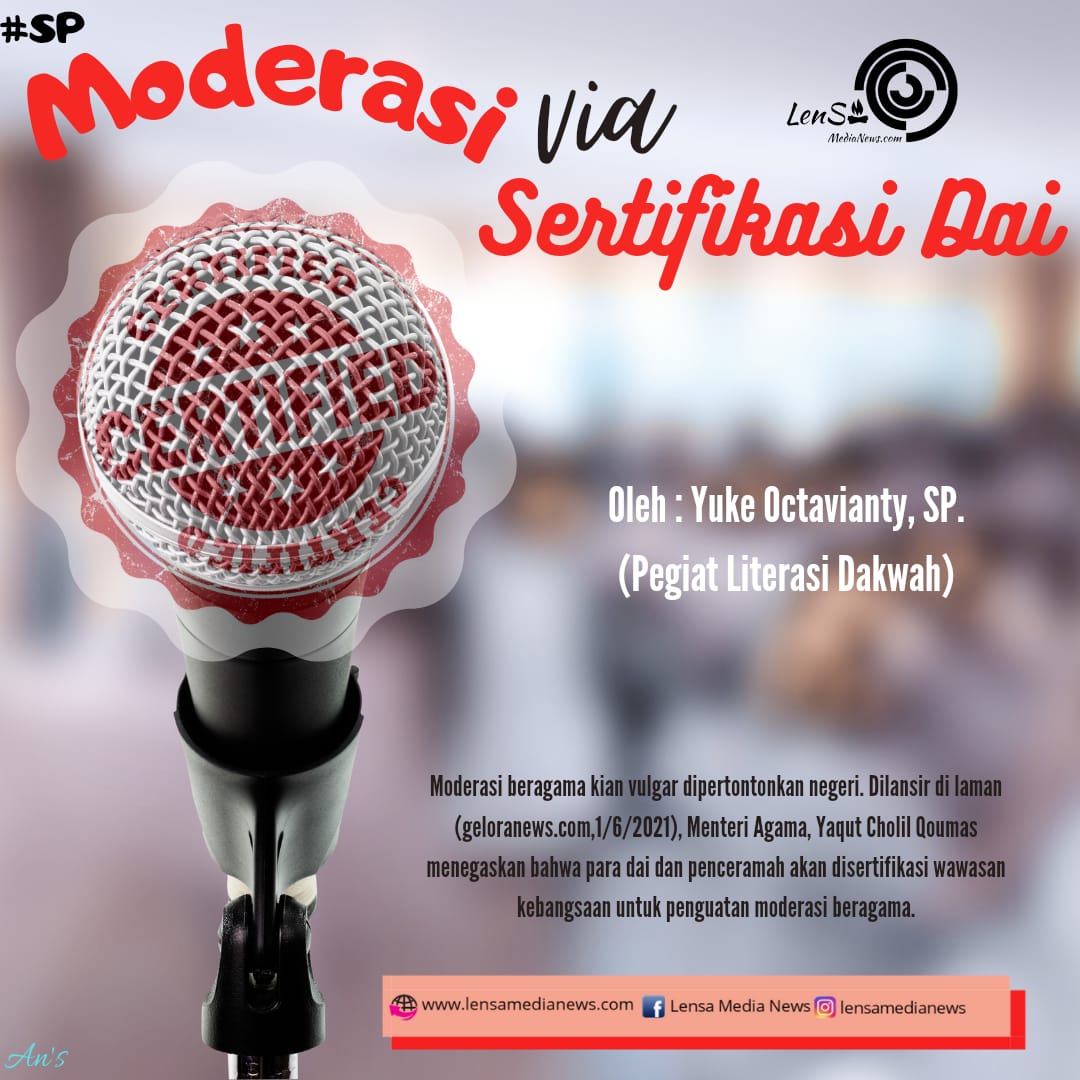 Moderasi beragama kian vulgar dipertontonkan negeri. Dilansir di laman (geloranews.com,1/6/2021), Menteri Agama, Yaqut Cholil Qoumas menegaskan bahwa para dai dan penceramah akan disertifikasi wawasan kebangsaan untuk penguatan moderasi beragama. Saat ini, moderasi beragama menjadi salah satu tujuan pokok dari arah kebijakan dan strategi pemerintah menuju revolusi mental dan pembangunan kebudayaan. Demikian lanjutnya.