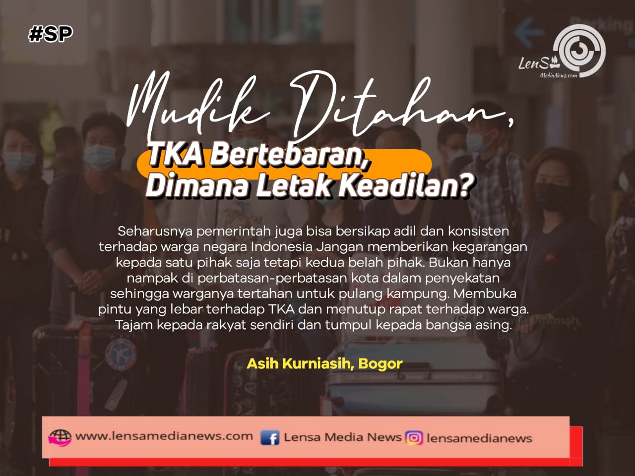 Seharusnya pemerintah juga bisa bersikap adil dan konsisten terhadap warga negara Indonesia Jangan memberikan kegarangan kepada satu pihak saja tetapi kedua belah pihak. Bukan hanya nampak di perbatasan-perbatasan kota dalam penyekatan sehingga warganya tertahan untuk pulang kampung. Membuka pintu yang lebar terhadap TKA dan menutup rapat terhadap warga. Tajam kepada rakyat sendiri dan tumpul kepada bangsa asing. Dengan adanya keadilan, maka akan munculah kepercayaan warga terhadap kebijakan-kebijakan pemerintah yang lain, tidak hanya soal kebijakan larangan mudik saja.