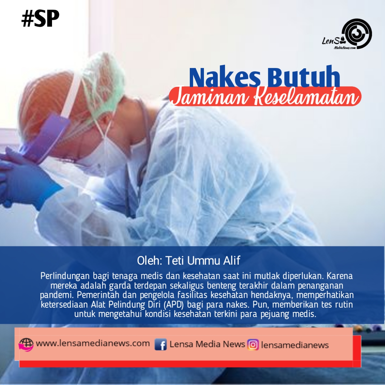 Perlindungan bagi tenaga medis dan kesehatan saat ini mutlak diperlukan. Karena mereka adalah garda terdepan sekaligus benteng terakhir dalam penanganan pandemi. Pemerintah dan pengelola fasilitas kesehatan hendaknya, memperhatikan ketersediaan Alat Pelindung Diri (APD) bagi para nakes. Pun, memberikan tes rutin untuk mengetahui kondisi kesehatan terkini para pejuang medis.