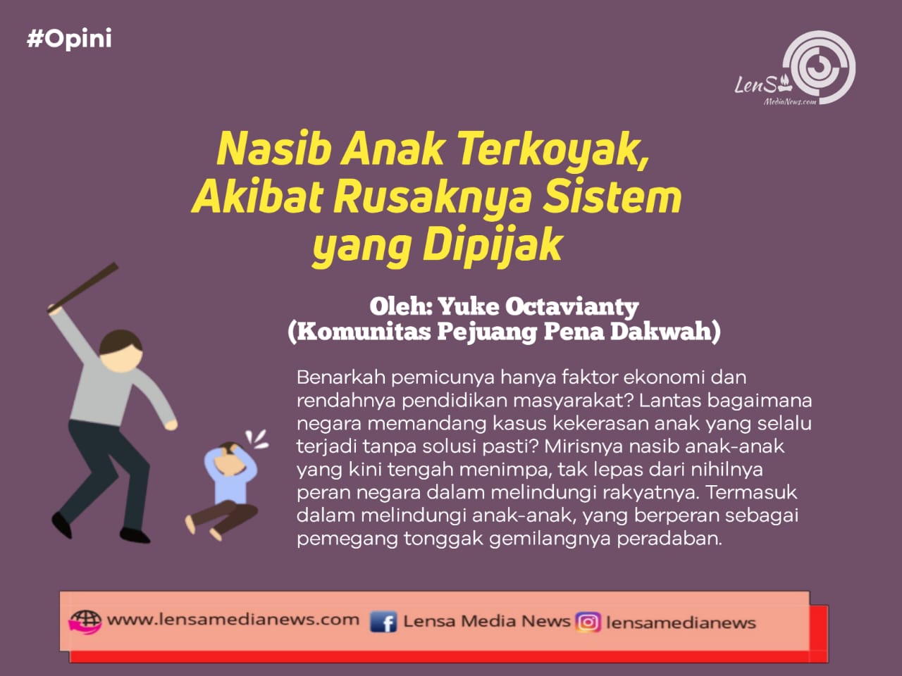 Lensa Media News – Maraknya kekerasan pada anak kian hari kian meningkat. Beberapa media mencatat bahwa kekerasan terjadi hampir di setiap wilayah. Salah satunya, Padang, Sumatera Barat. Hal itu disampaikan oleh Kepala Dinas Pemberdayaan Perempuan Perlindungan Anak Pengendalian Penduduk dan Keluarga Berencana (DP3AP2KB) Kota Padang Editiawarman (kompas.com, 1/11/2021). Rata-rata, faktor penyebabnya adalah faktor ekonomi dan rendahnya pendidikan masyarakat. Mirisnya lagi, pelaku kekerasan adalah orang terdekat korban, seperti kerabat, tetangga ataupun teman-teman korban.