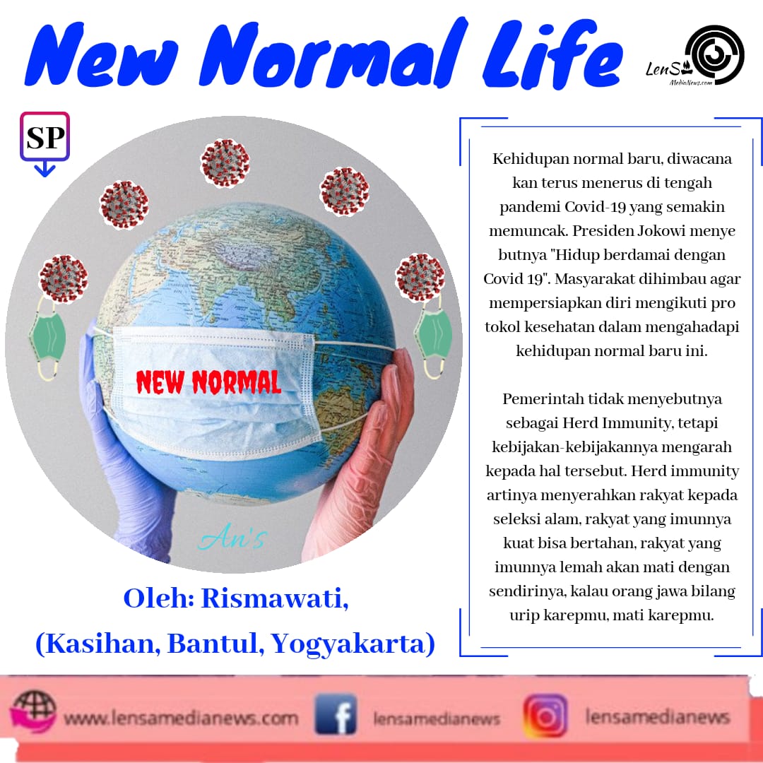 Kehidupan normal baru, diwacanakan terus menerus di tengah pandemi Covid-19 yang semakin memuncak. Presiden Jokowi menyebutnya “Hidup berdamai dengan Covid 19”. Masyarakat dihimbau agar mempersiapkan diri mengikuti protokol kesehatan dalam mengahadapi kehidupan normal baru ini.