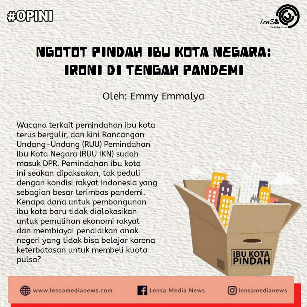 Lensa Media News – Wacana terkait pemindahan ibu kota terus bergulir, dan kini Rancangan Undang-Undang (RUU) Pemindahan Ibu Kota Negara (RUU IKN) sudah masuk DPR. Pemindahan ibu kota ini seakan dipaksakan, tak peduli dengan kondisi rakyat Indonesia yang sebagian besar terimbas pandemi. Kenapa dana untuk pembangunan ibu kota baru tidak dialokasikan untuk pemulihan ekonomi rakyat dan membiayai pendidikan anak negeri yang tidak bisa belajar karena keterbatasan untuk membeli kuota pulsa?
