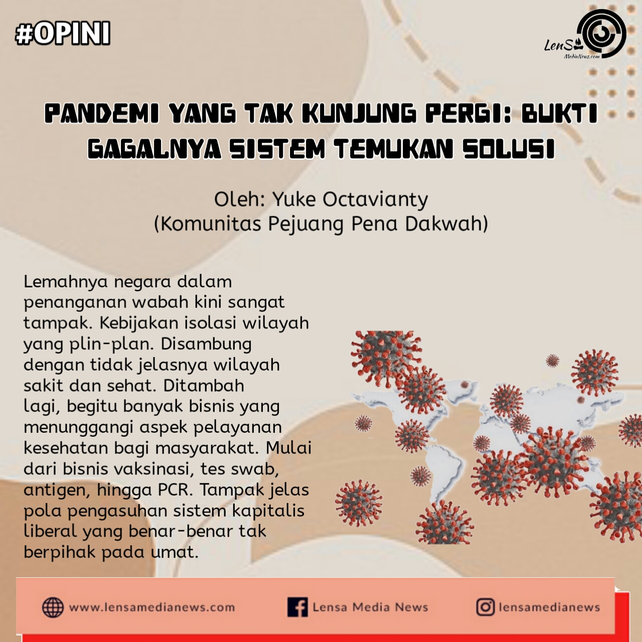Lemahnya negara dalam penanganan wabah kini sangat tampak. Kebijakan isolasi wilayah yang plin-plan. Disambung dengan tidak jelasnya wilayah sakit dan sehat. Ditambah lagi, begitu banyak bisnis yang menunggangi aspek pelayanan kesehatan bagi masyarakat. Mulai dari bisnis vaksinasi, tes swab, antigen, hingga PCR. Tampak jelas pola pengasuhan sistem kapitalis liberal yang benar-benar tak berpihak pada umat.