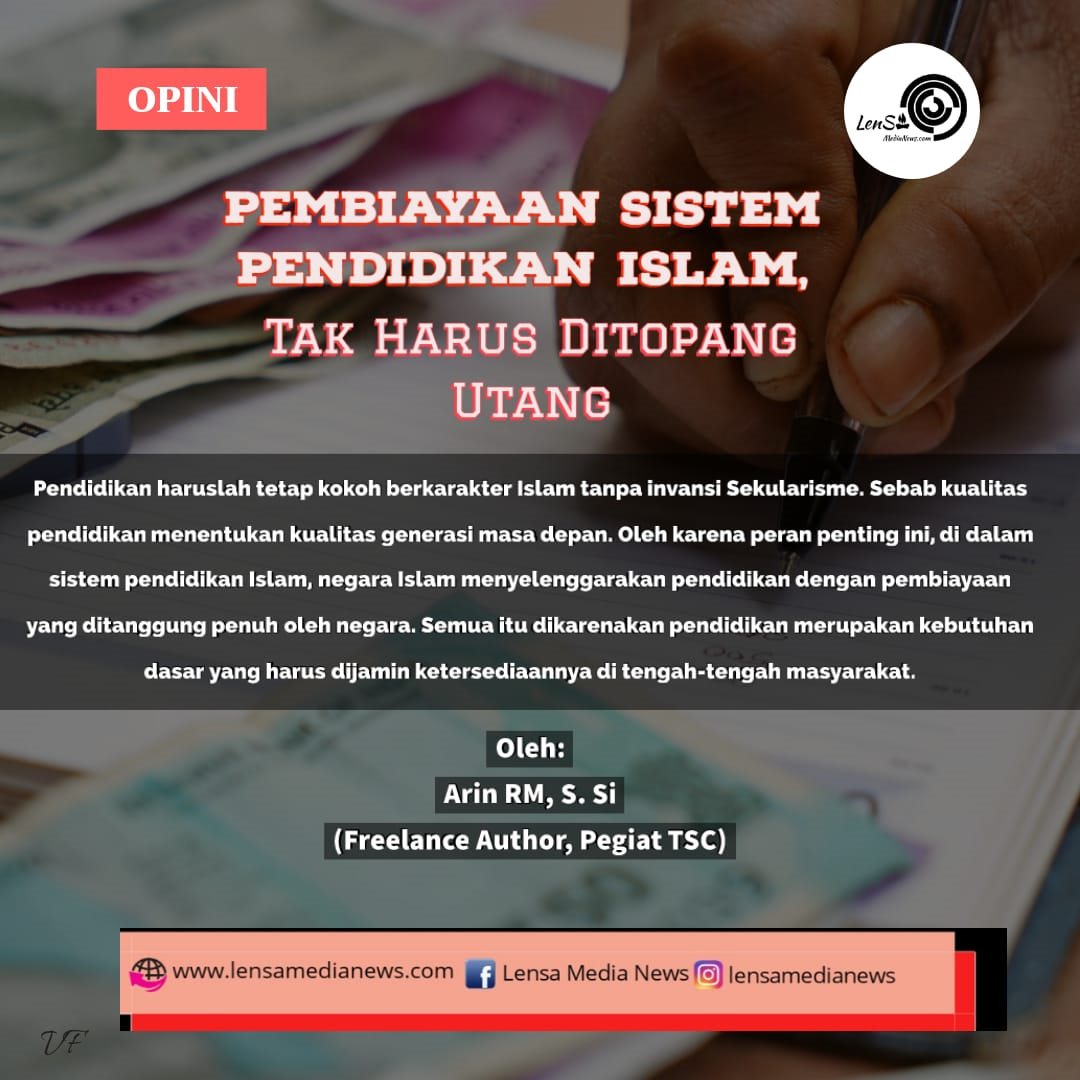 Oleh sebab itu, sudah selayaknya pendidikan dunia saat ini meniru kemandirian sistem pendidikan Islam. Sepenuhnya di bawah kendali negara dengan dukungan dana mandiri dalam negeri. Tanpa ditopang utang, niscaya pendidikan dapat diarahkan untuk mencetak aset generasi bangsa yang unggul dan siap memimpin dunia.