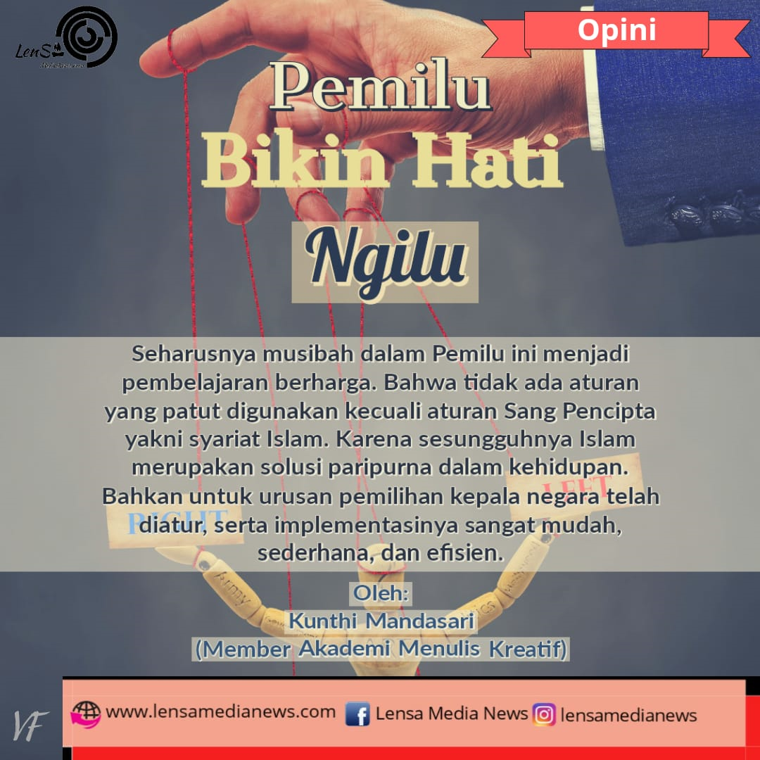 Seharusnya musibah dalam Pemilu ini menjadi pembelajaran berharga. Bahwa tidak ada aturan yang patut digunakan kecuali aturan Sang Pencipta yakni syariat Islam. Karena sesungguhnya Islam merupakan solusi paripurna dalam kehidupan. Bahkan untuk urusan pemilihan kepala negara telah diatur, serta implementasinya sangat mudah, sederhana, dan efisien.