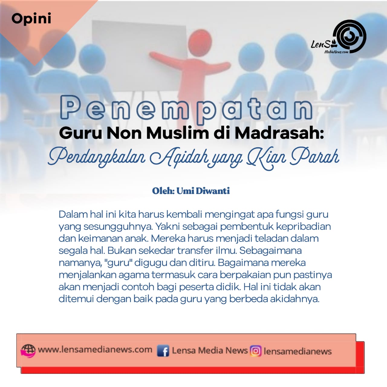 Dalam hal ini kita harus kembali mengingat apa fungsi guru yang sesungguhnya. Yakni sebagai pembentuk kepribadian dan keimanan anak. Mereka harus menjadi teladan dalam segala hal. Bukan sekadar transfer ilmu. Sebagaimana namanya, “guru” digugu dan ditiru. Bagaimana mereka menjalankan agama termasuk cara berpakaian pun pastinya akan menjadi contoh bagi peserta didik. Hal ini tidak akan ditemui dengan baik pada guru yang berbeda akidahnya.