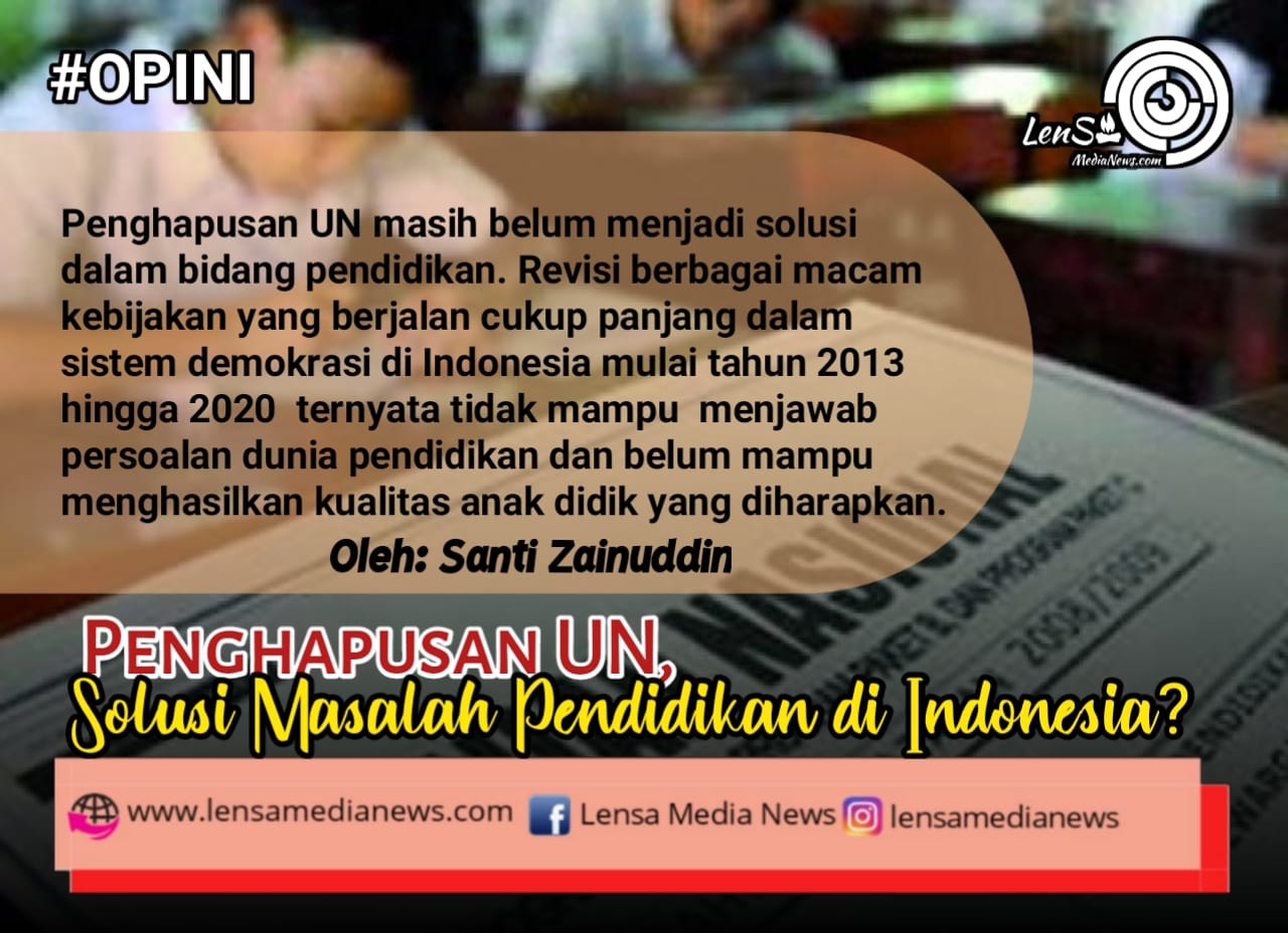 Penghapusan UN masih belum menjadi solusi dalam bidang pendidikan. Revisi berbagai macam kebijakan yang berjalan cukup panjang dalam sistem demokrasi di Indonesia mulai tahun 2013 hingga 2020 ternyata tidak mampu menjawab persoalan dunia pendidikan dan belum mampu menghasilkan kualitas anak didik yang diharapkan. Tujuan pendidikan nasional yang tercantum dalam Undang-undang Nomor 20 tahun 2003 dan Undang-undang Nomor 2 tahun 1989, yaitu untuk membangun potensi peserta didik agar menjadi manusia yang beriman dan bertakwa kepada Tuhan Yang Maha Esa, berakhlak mulia, sehat, berilmu, cakap, kreatif, dan menjadi warga negara yang mandiri serta demokratis.