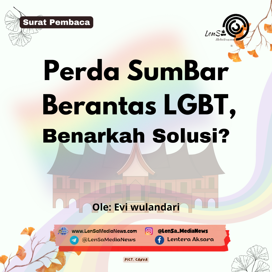LenSa Media News _ Opini _ Dewan Perwakilan Rakyat Daerah (DPRD) Provinsi Sumatera Barat (Sumbar) sedang mengkaji rencana pembentukan peraturan daerah (Perda) untuk anggota penyakit masyarakat terutama lesbian, gay, biseksual dan transgender (LGBT), di Ranah Minang. “DPRD Sumbar sedang mengkaji kemungkinan terbentuknya perda terkait LGBT,” kata Wakil Ketua DPRD Provinsi Sumbar Nanda Satria di Padang, Sumatera Barat, Sabtu. Apakah ini akan menjadi jalan keluar?