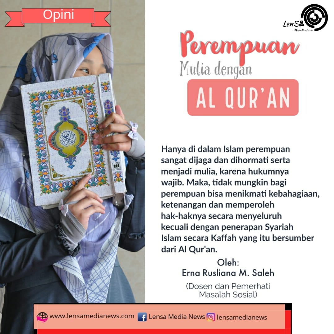 Hanya di dalam Islam perempuan sangat dijaga dan dihormati serta menjadi mulia, karena hukumnya wajib. Maka, tidak mungkin bagi perempuan bisa menikmati kebahagiaan, ketenangan, dan memperoleh hak-haknya secara menyeluruh kecuali dengan penerapan syariah Islam secara kaffah yang itu bersumber dari Al Qur’an. Ketika Al-Qur’an yang menjadi sumber ajaran Islam diterapkan dalam semua aspek kehidupan, kemuliaan tidak hanya bagi perempuan tapi bagi semua umat manusia.