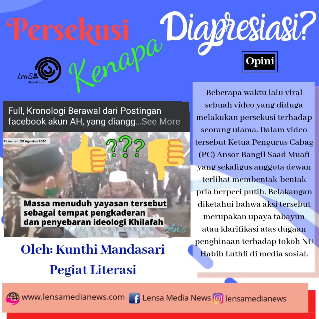 Lensa Media News – Beberapa waktu lalu viral sebuah video yang diduga melakukan persekusi terhadap seorang ulama. Dalam video tersebut Ketua Pengurus Cabag (PC) Ansor Bangil Saad Muafi yang sekaligus anggota dewan terlihat membentak-bentak pria berpeci putih. Belakangan diketahui bahwa aksi tersebut merupakan upaya tabayun atau klarifikasi atas dugaan penghinaan terhadap tokoh NU Habib Luthfi di media sosial.