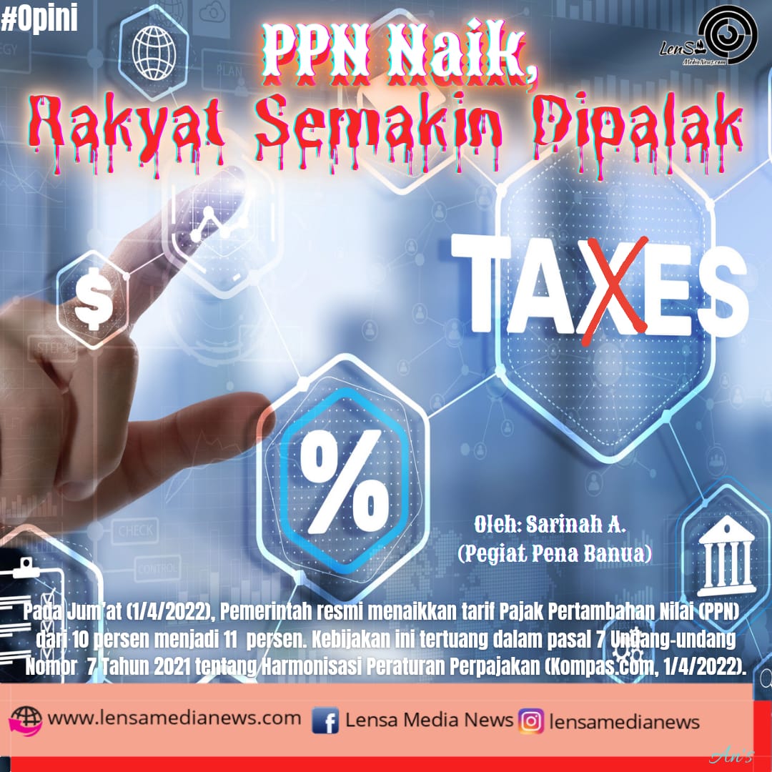 Lensa Media News – Pada Jum’at (1/4/2022), Pemerintah resmi menaikkan tarif Pajak Pertambahan Nilai (PPN) dari 10 persen menjadi 11 persen. Kebijakan ini tertuang dalam pasal 7 Undang-undang Nomor 7 Tahun 2021 tentang Harmonisasi Peraturan Perpajakan (Kompas.com, 1/4/2022).