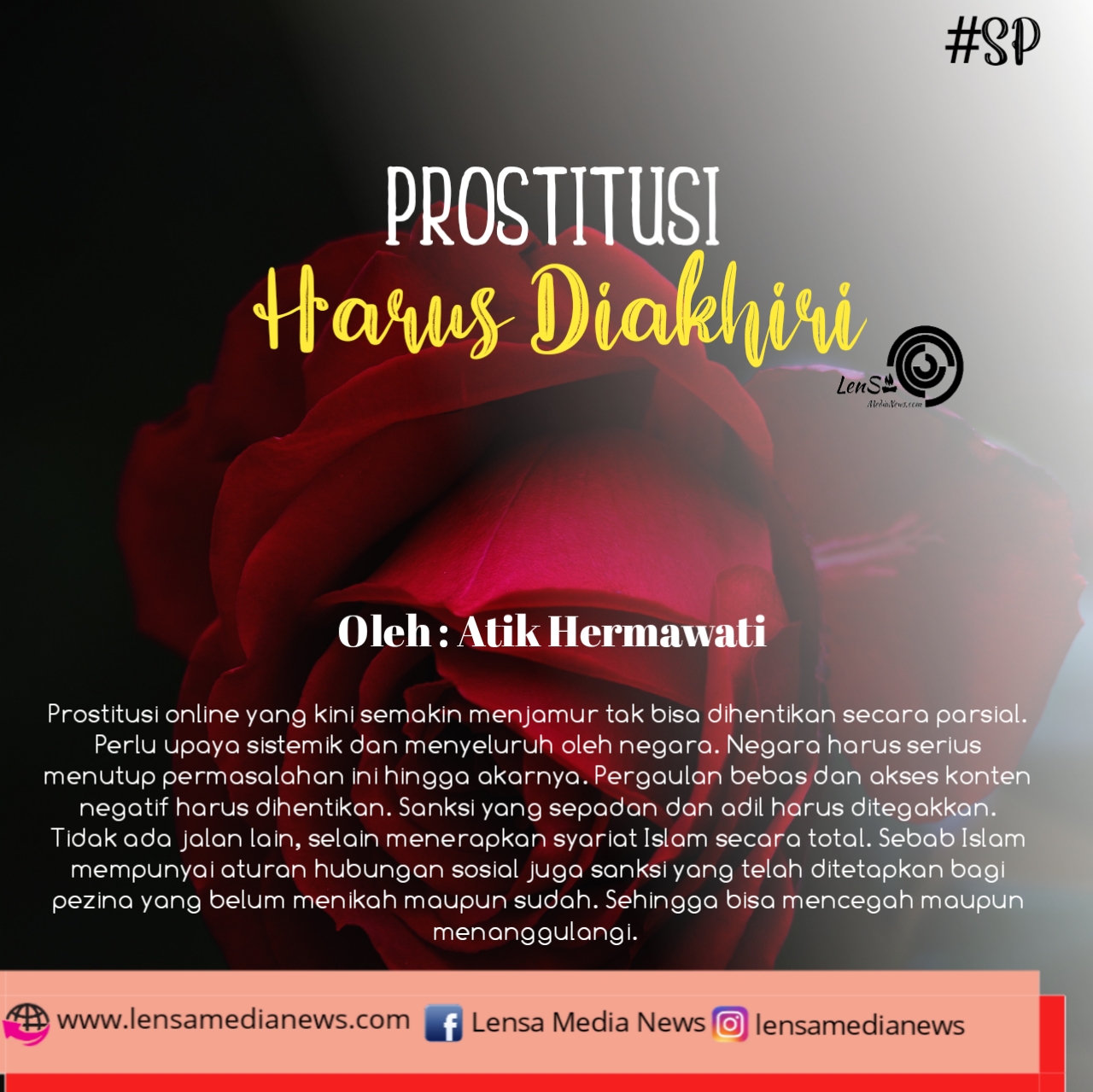 Prostitusi online yang kini semakin menjamur tak bisa dihentikan secara parsial. Perlu upaya sistemik dan menyeluruh oleh negara. Negara harus serius menutup permasalahan ini hingga akarnya. Pergaulan bebas dan akses konten negatif harus dihentikan. Sanksi yang sepadan dan adil harus ditegakkan. Tidak ada jalan lain, selain menerapkan syariat Islam secara total. Sebab Islam mempunyai aturan hubungan sosial juga sanksi yang telah ditetapkan bagi pezina yang belum menikah maupun sudah. Sehingga bisa mencegah maupun menanggulangi.