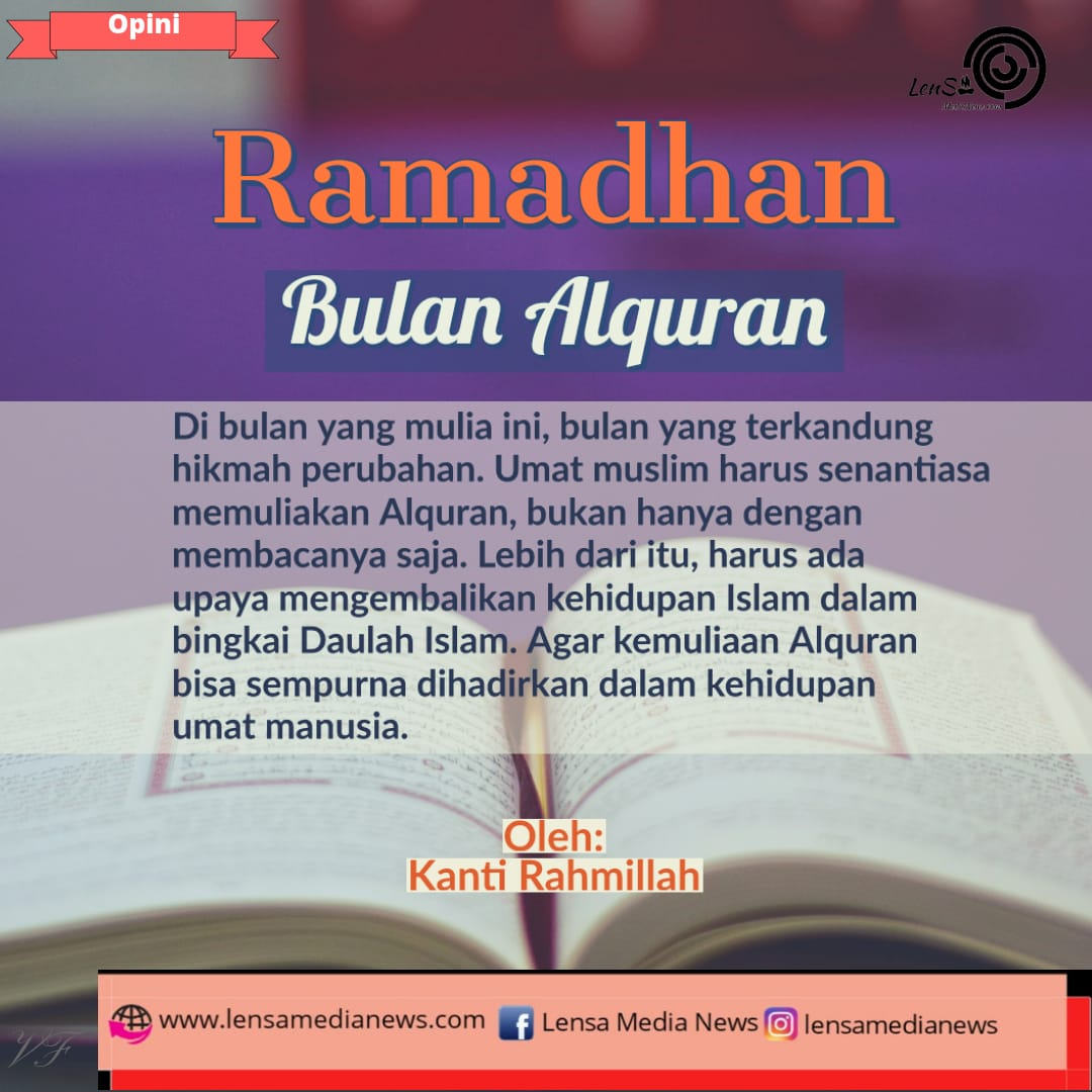 Oleh karena itu, di bulan yang mulia ini, bulan yang terkandung hikmah perubahan. Umat muslim harus senantiasa memuliakan Alquran, bukan hanya dengan membacanya saja. Lebih dari itu, harus ada upaya mengembalikan kehidupan Islam dalam bingkai Daulah Islam. Agar kemuliaan Alquran bisa sempurna dihadirkan dalam kehidupan umat manusia.