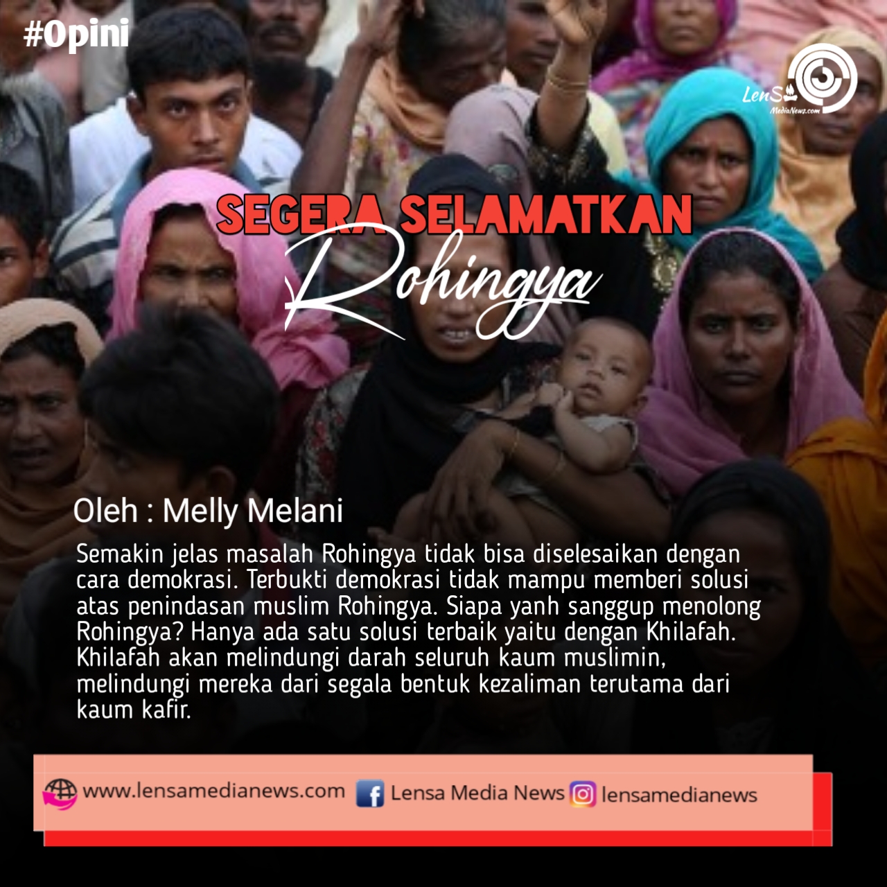 Semakin jelas masalah Rohingya tidak bisa diselesaikan dengan cara demokrasi. Terbukti demokrasi tidak mampu memberi solusi atas penindasan muslim Rohingya. Siapa yang sanggup menolong Rohingya? Hanya ada satu solusi terbaik yaitu dengan Khilafah. Khilafah akan melindungi darah seluruh kaum muslimin, melindungi mereka dari segala bentuk kezaliman terutama dari kaum kafir.