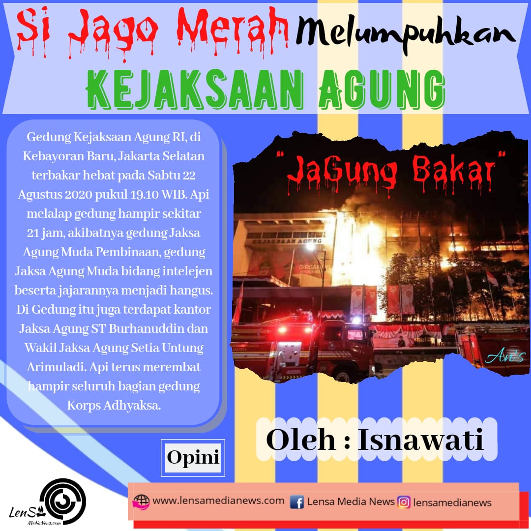 Lensa Media News – Gedung Kejaksaan Agung RI, di Kebayoran Baru, Jakarta Selatan terbakar hebat pada Sabtu 22 Agustus 2020 pukul 19.10 WIB. Api melalap gedung hampir sekitar 21 jam, akibatnya gedung Jaksa Agung Muda Pembinaan, gedung Jaksa Agung Muda bidang intelejen beserta jajarannya menjadi hangus. Di Gedung itu juga terdapat kantor Jaksa Agung ST Burhanuddin dan Wakil Jaksa Agung Setia Untung Arimuladi. Api terus merembat hampir seluruh bagian gedung Korps Adhyaksa.